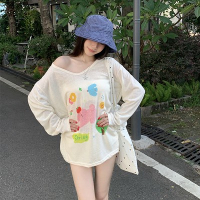 스트라이프 트럼펫 긴팔 선 스크린 티셔츠 여름에 여성을위한 느슨한 게으른 스타일 탑
