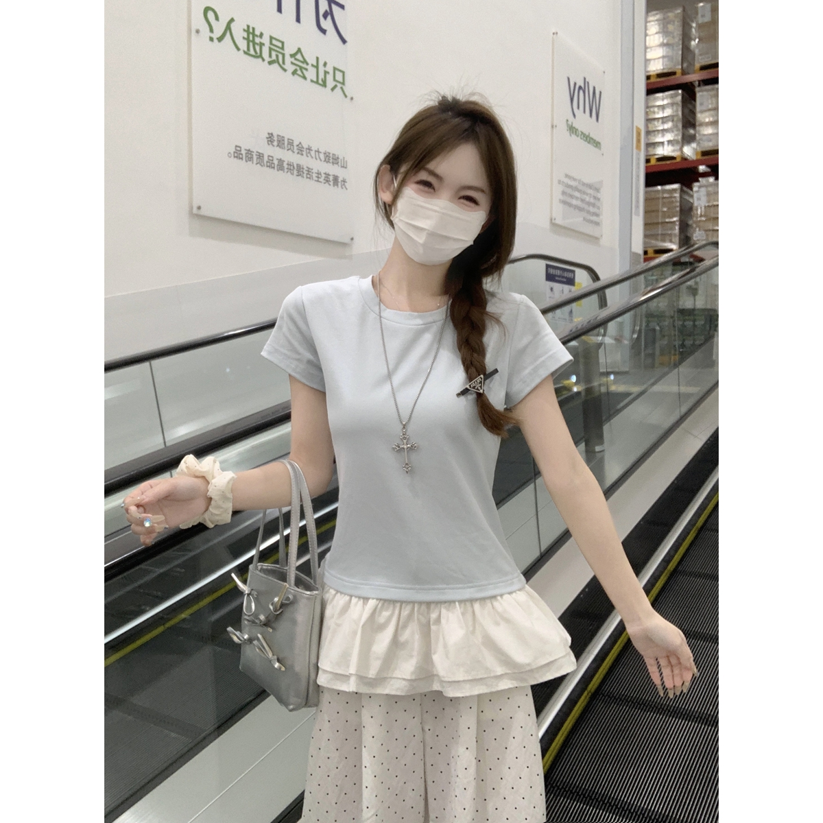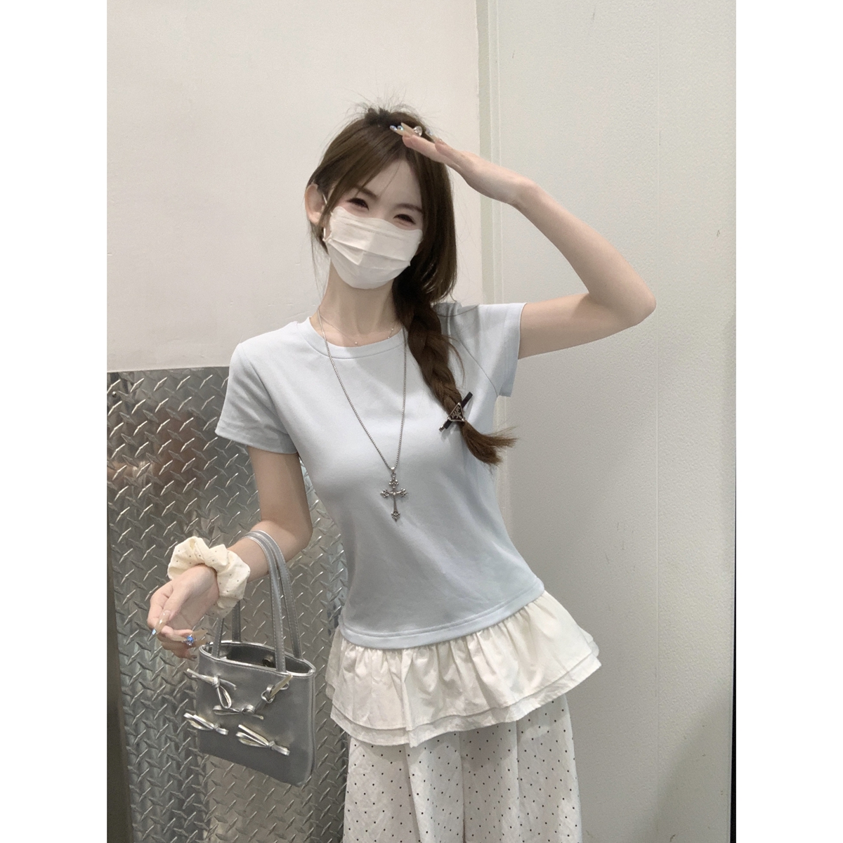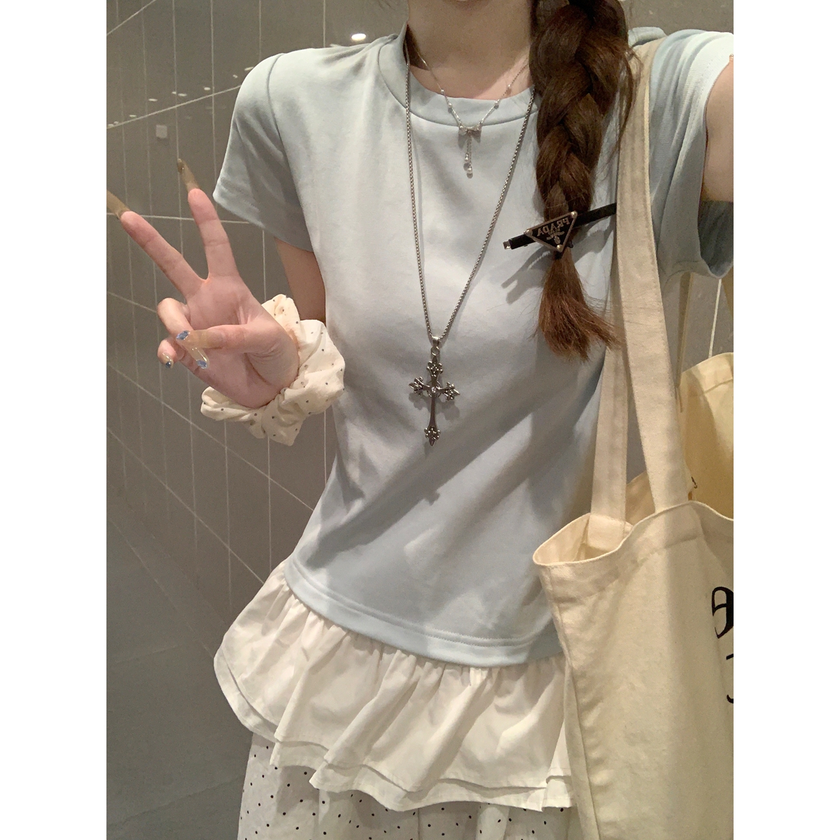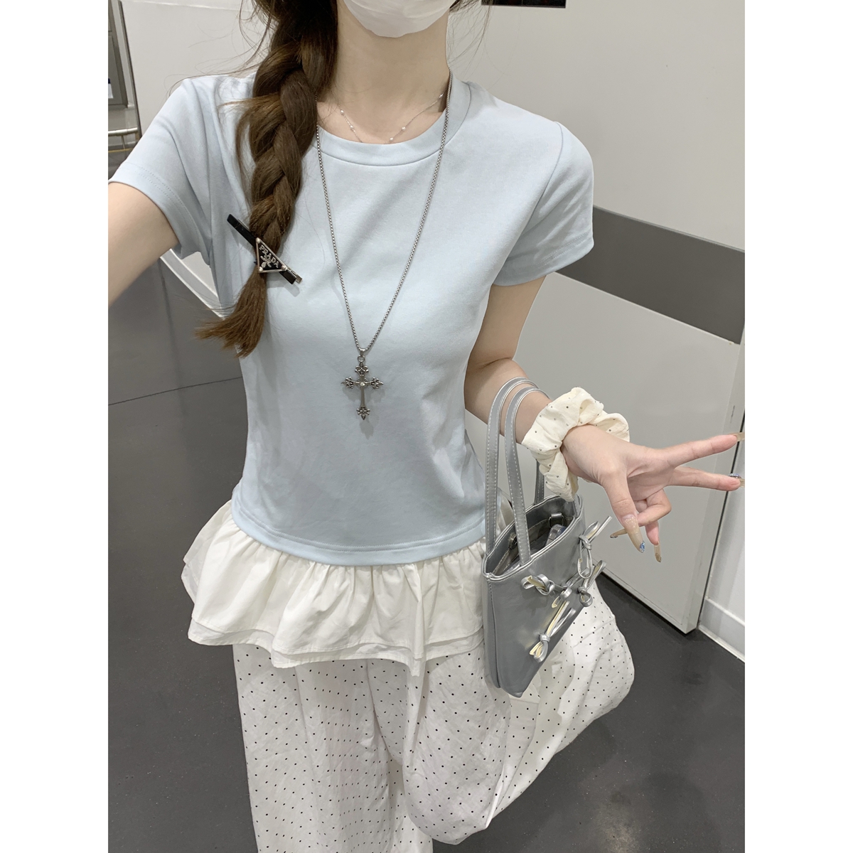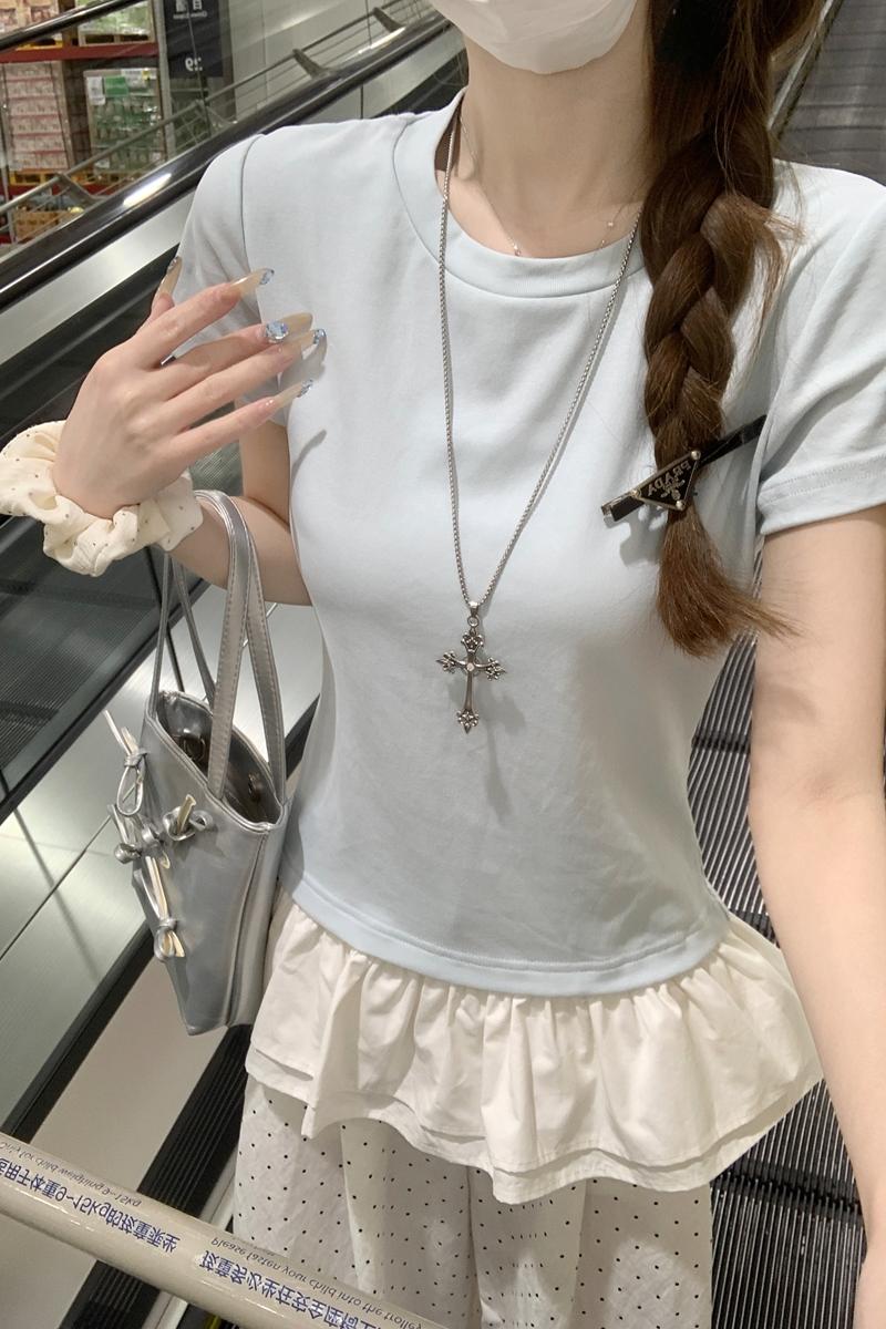 스프링 스프링 기질 오프 숄더 주름 디자인 리벳 핫 걸 슬림 긴 슬림 티셔츠 탑