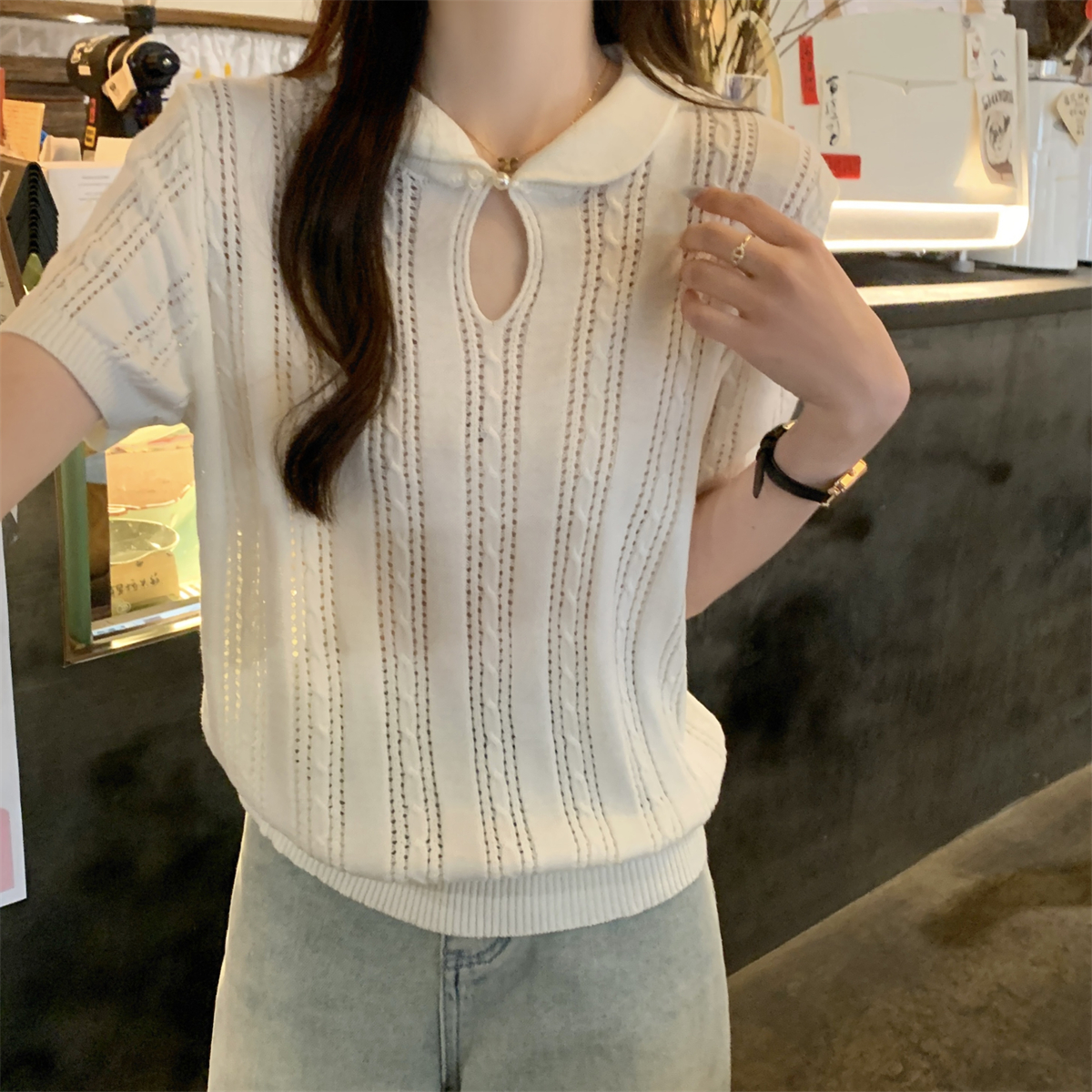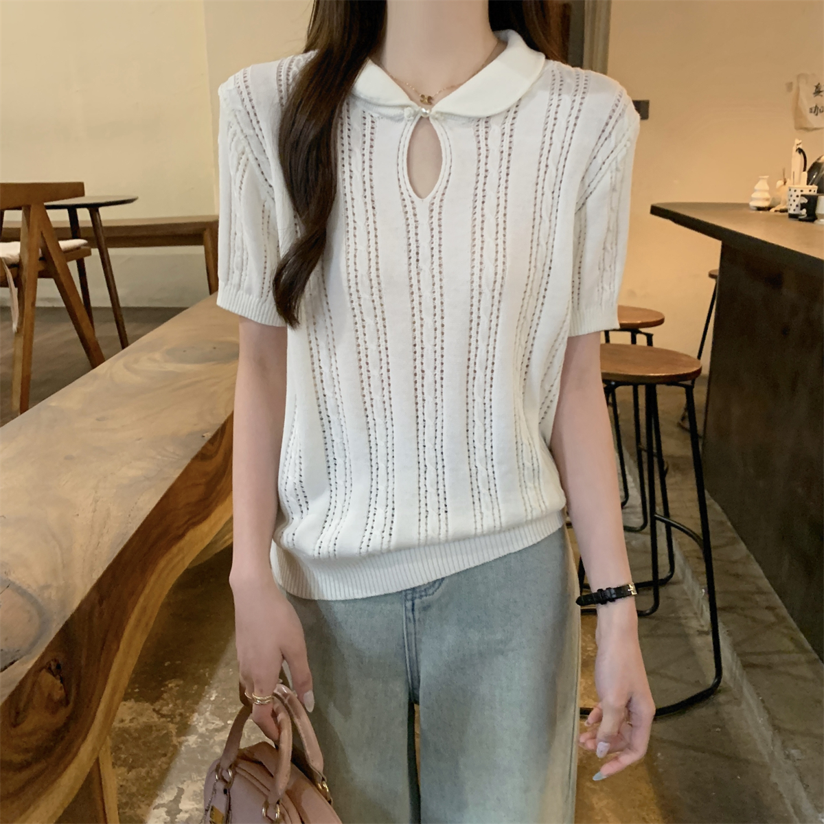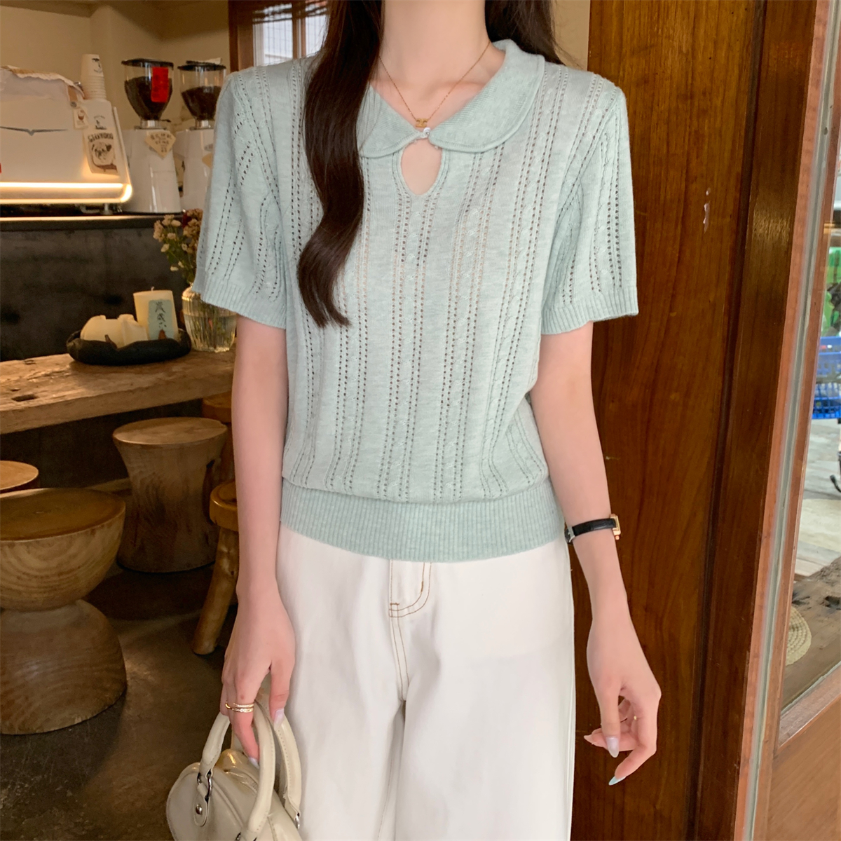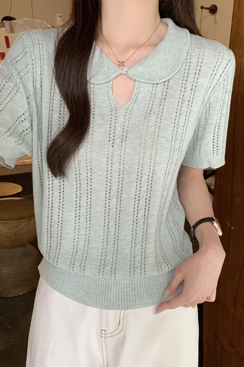 여름 슬림 기질 U-Neck 간단한 단색 얇은 6 개 양모 스웨터 단락 상단
