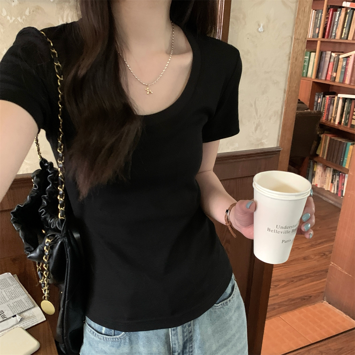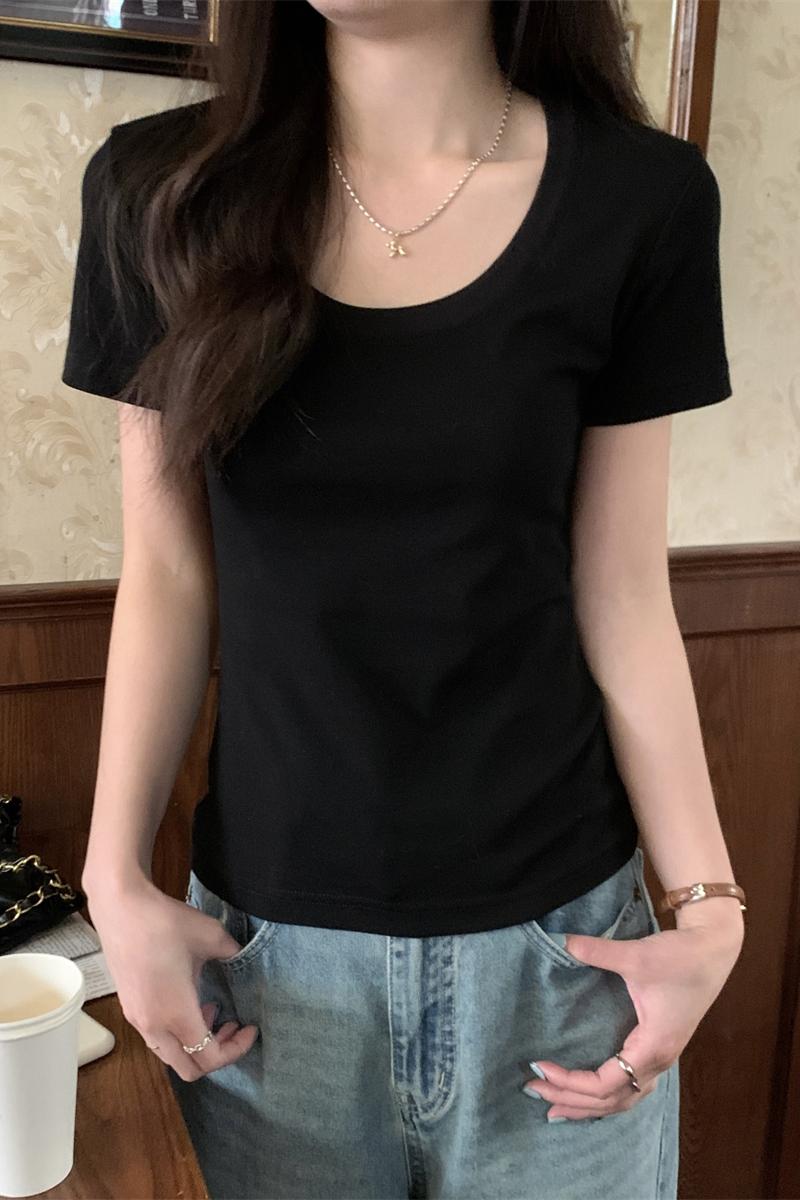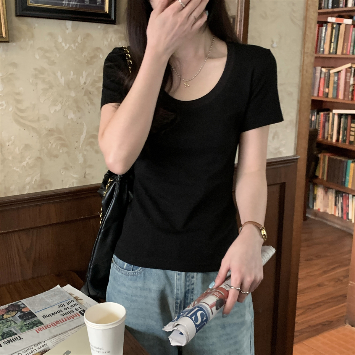 여름 한국 스타일 순수하고 경사적 인 어깨 주름 디자인 라이저 슬림 짧은 슬림 티셔츠 탑