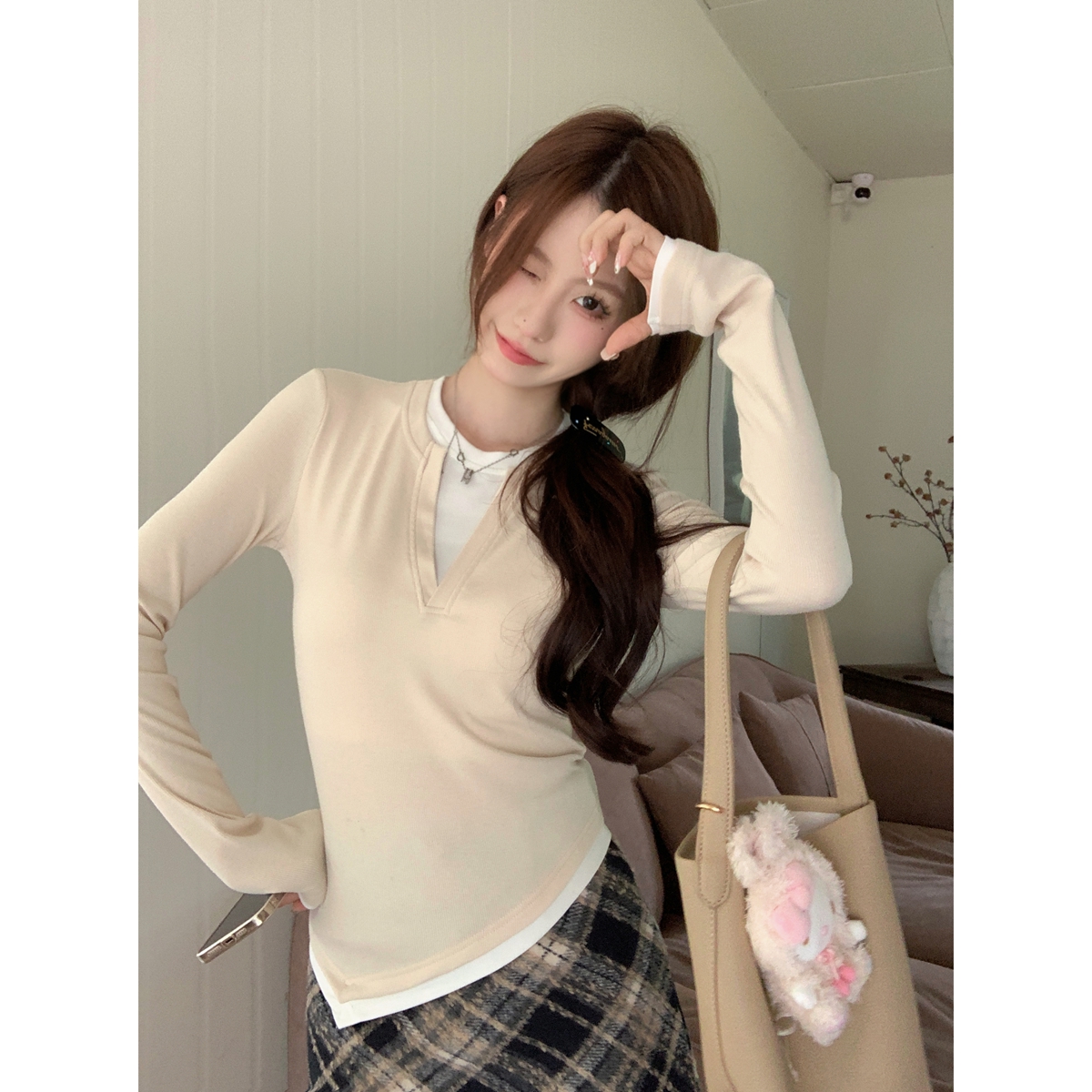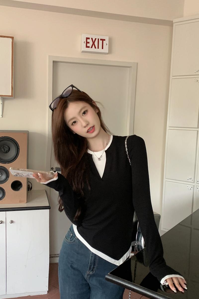 스프링 스프링 Square Neck Slim 기질 구덩이 스트립 앤디 벨벳 니트 스웨터베이스 탑