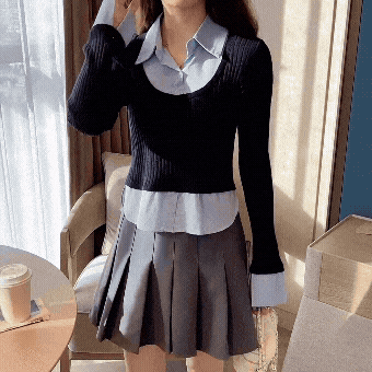 셔츠와 니트를 레이어드한 듯한 투피스 스타일의 블루 긴팔 탑. 가을 시즌 프렌치 감성으로 멋스럽게 연출하기 좋은 아이템입니다.