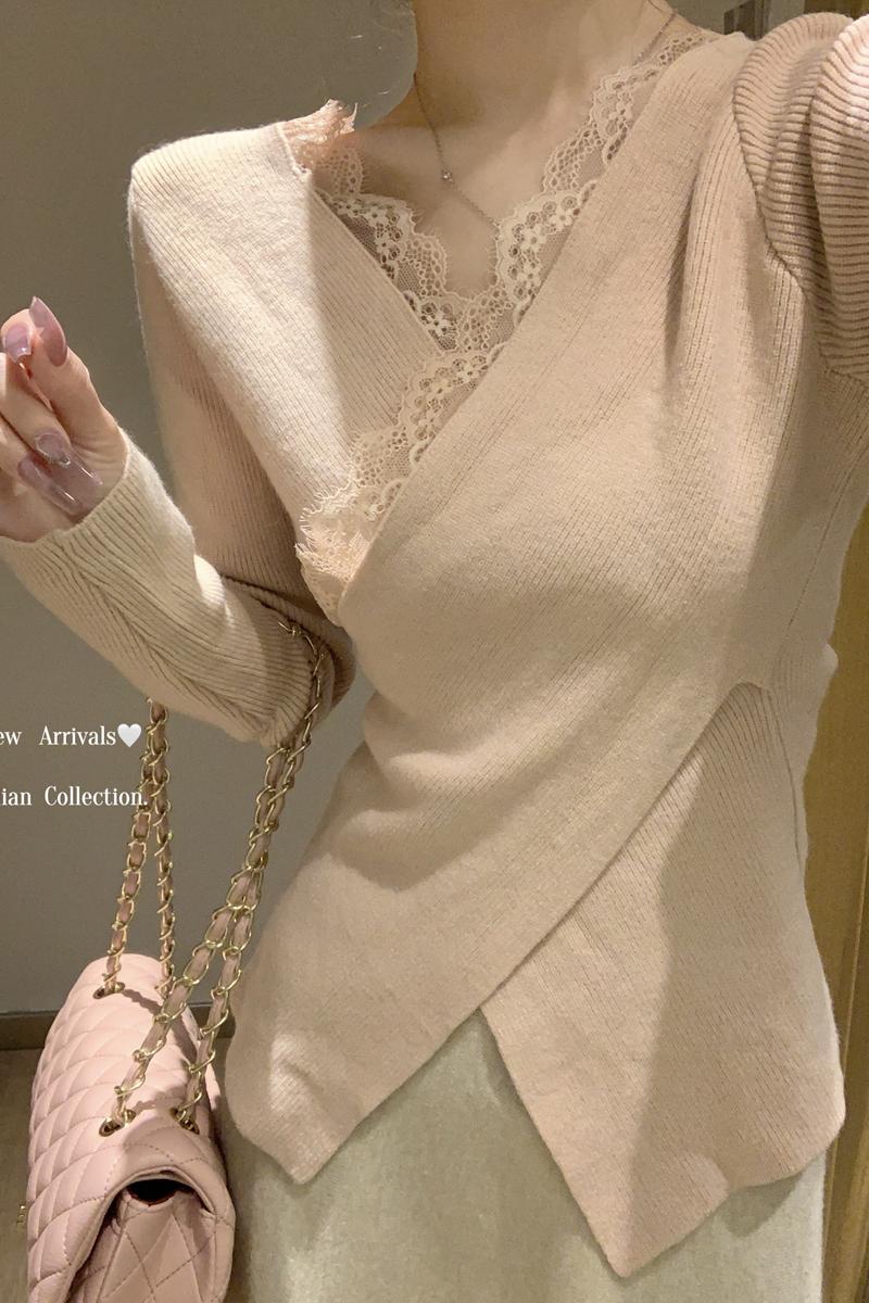 가을 겨울 순수하고 부드러운 레이스 구멍을 뚫는 V- 넥 앤디 벨벳 스웨터 긴 소매 스웨터 재킷
