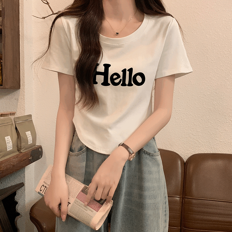 티셔츠 여성의 풀오버 곡선 곡기 밑단 짧은 슬림