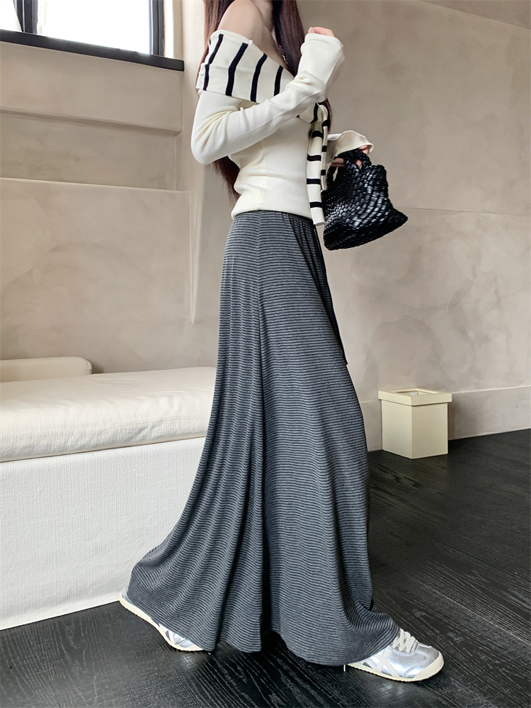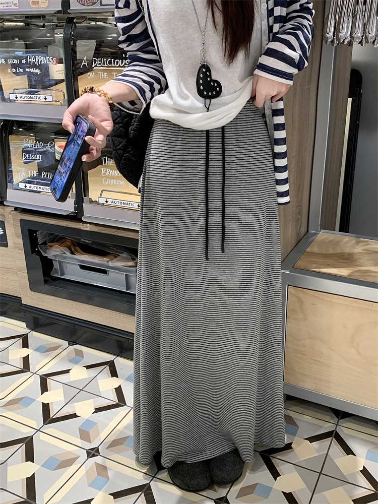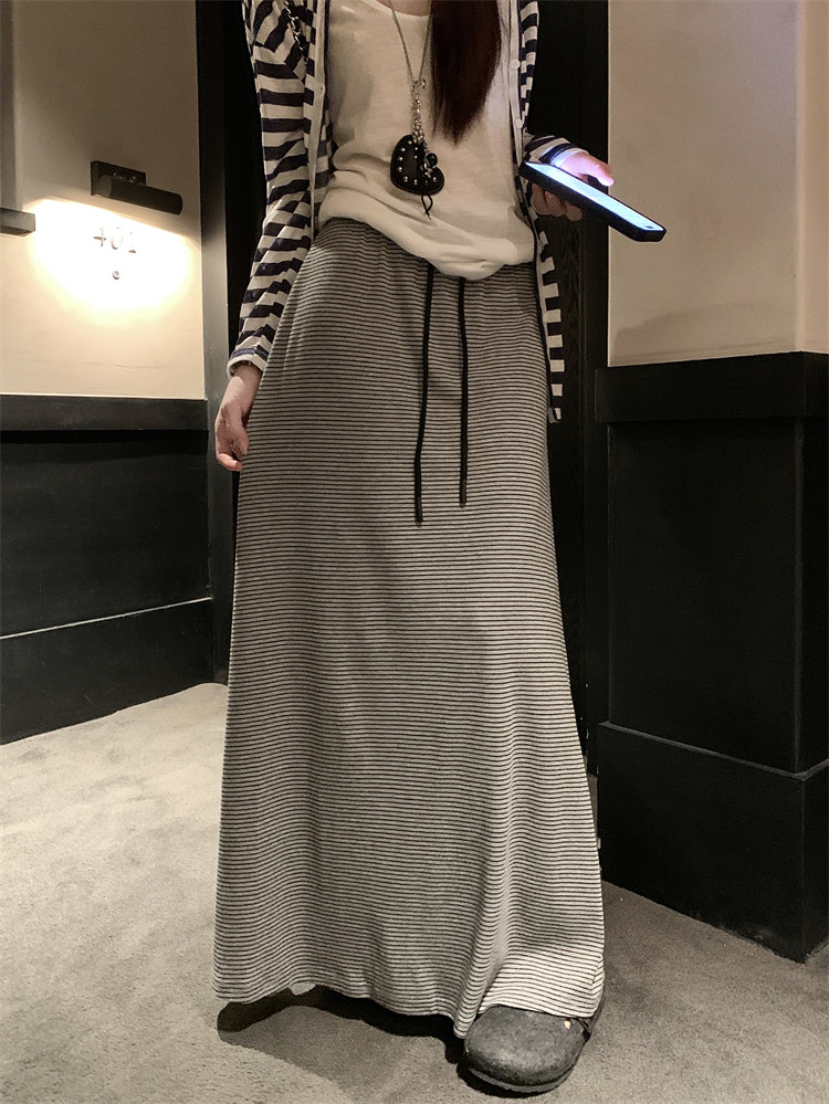 여성을위한 실제 캐주얼 및 다재다능한 회색 줄무늬 드로우 스트링 A- 라인 스커트, 게으른 스타일 하이 허리 슬림 미디 스커트