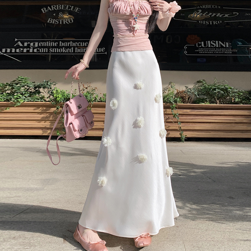 허리가 높은 여성을위한 실제 새로운 아세테이트 새틴 3 차원 꽃 치마가 높은 허리 슬림하고 슬림 한 a-line 낚시 테일 롱 스커트