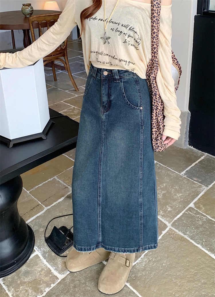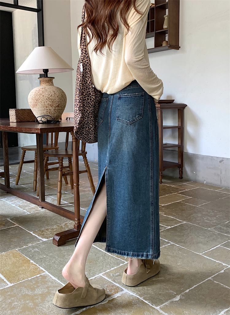 실제 샷, 실제 가격 ~ 여성의 새로운 하이 허리 슬림 한 중간 길이 슬릿 스커트를위한 미국 레트로 데님 스커트