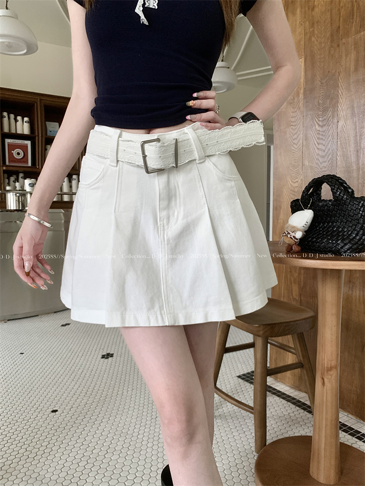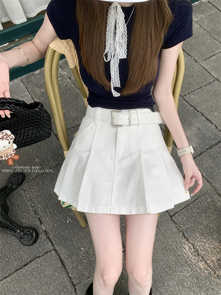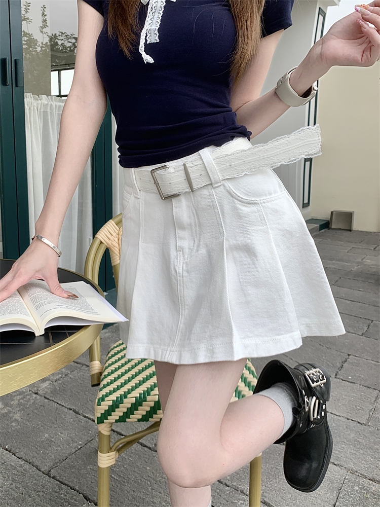 진짜 샷 실제 가격 ~ 허리가 높은 여성을위한 흰색 주름 데님 스커트가 있습니다.