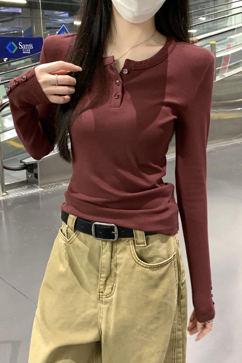 가을 가을 겨울 V- 넥 버튼 래그 어깨 디자인 슬림 긴 소매베이스 셔츠 티셔츠 여자 속옷 탑