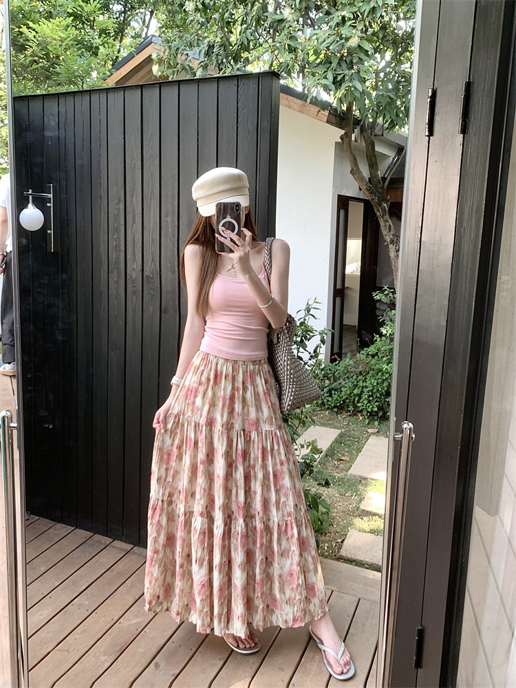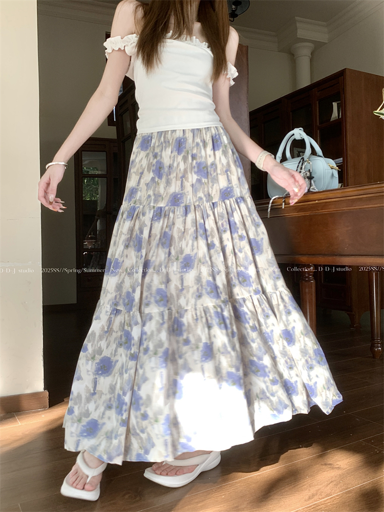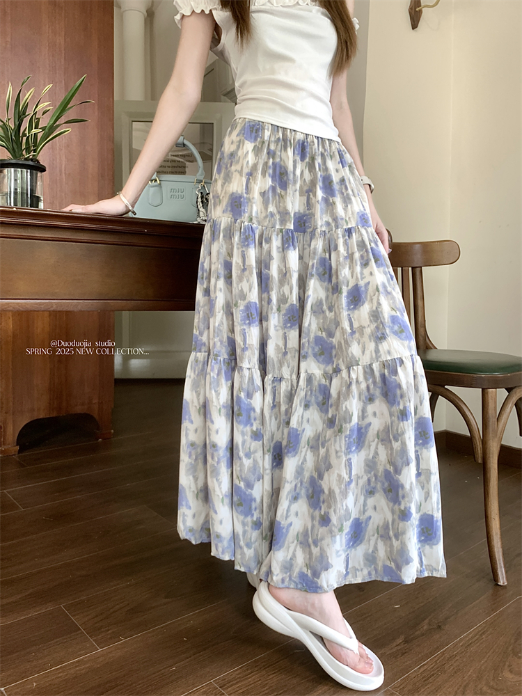 진짜 샷, 실제 가격 ~ 여름에 여성을위한 꽃 무늬 주름 케이크 치마 New High-Waist Looke A-Line 큰 미디 스커트