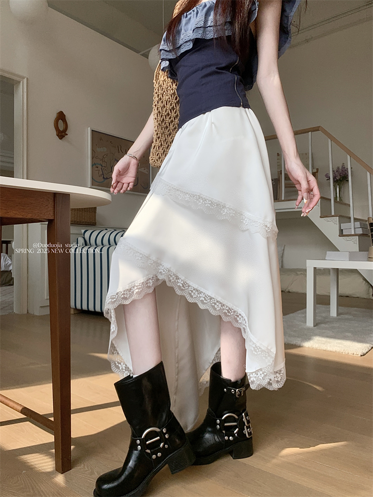 실제 샷 실제 가격 ~ 여성의 새로운 디자인 하이 허리 경사 미디 스커트를위한 흰색 불규칙 레이스 스커트