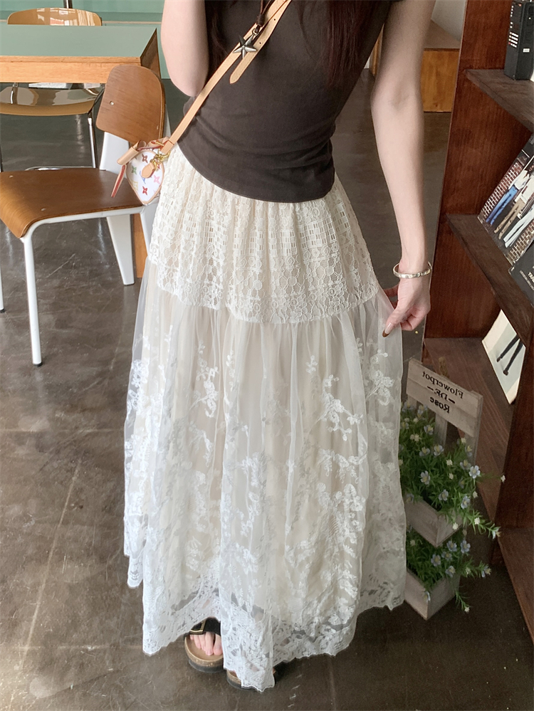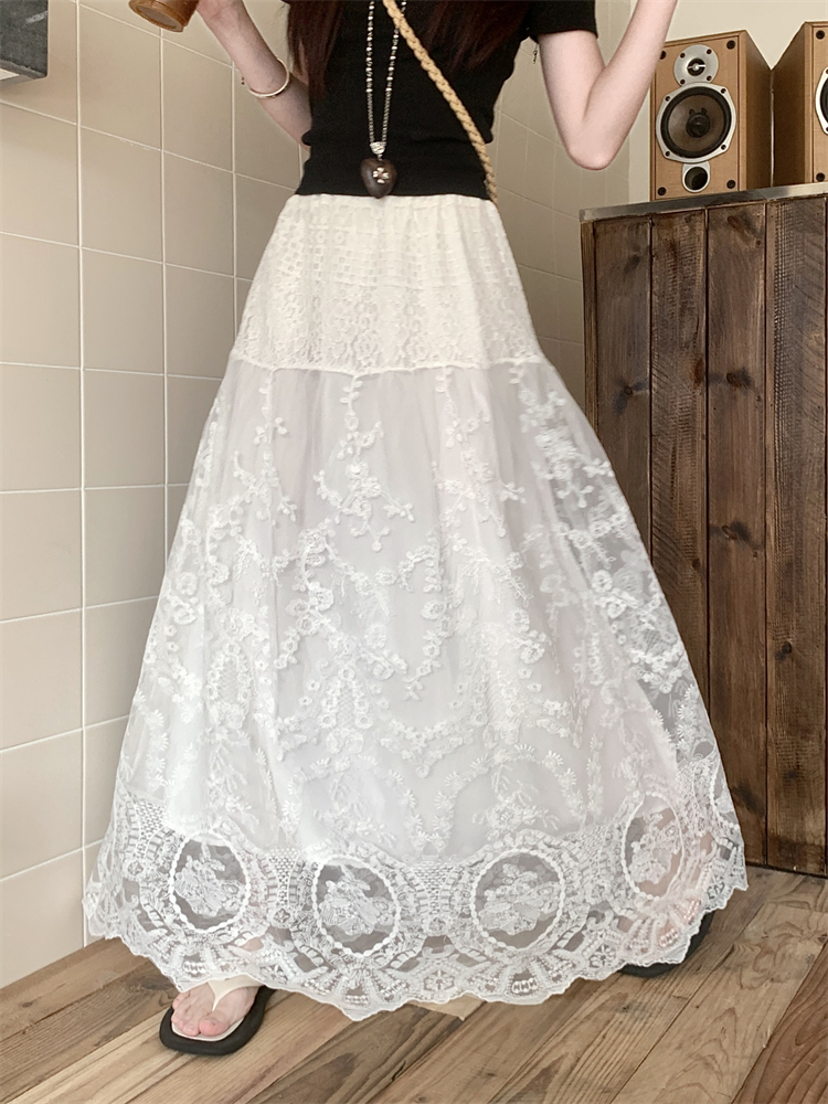 허리 슬림 한 A- 라인 틈새 디자인 탄성 허리 미드 길이 치마를 가진 여성을위한 실제 가격 프랑스 흰색 레이스 스커트