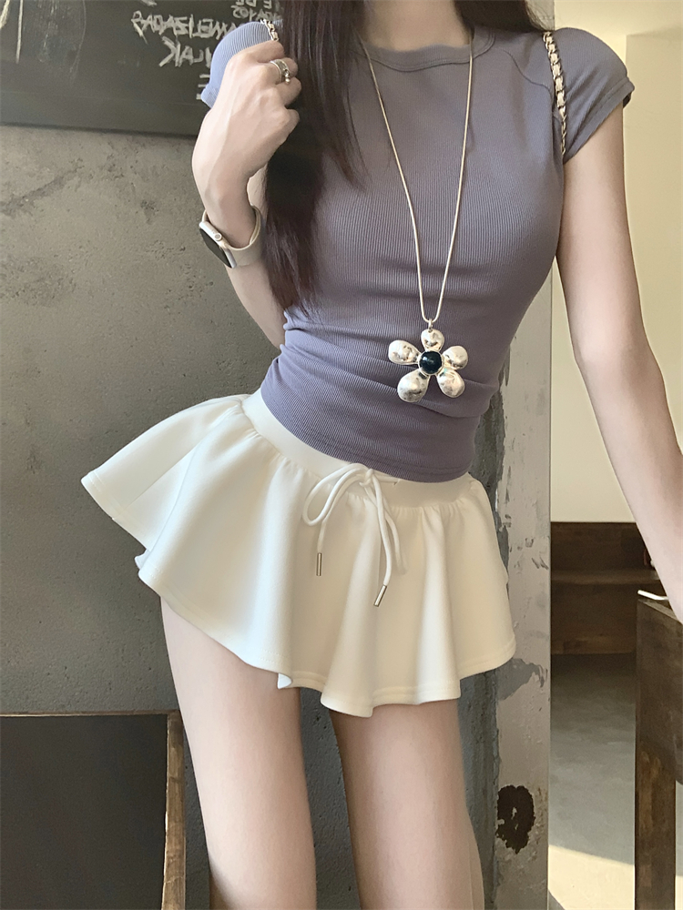 실제 사진과 실제 가격 ~ 발레 스타일의 회색 드로우 스트링 스커트 여성 뜨거운 여자를위한 슬림 한 A- 라인 탄성 허리 푹신한 다목적 짧은 치마