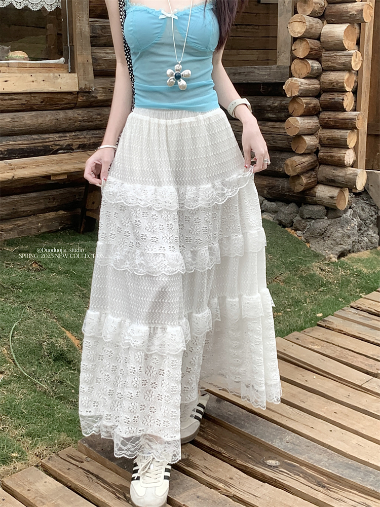 진짜 샷 진짜 가격 ~ 발레 스타일 흰색 하프 바디 긴 치마 부드러운 하이 허리 A- 라인 레이스 스 플라이 싱 요정 케이크 스커트 여성을위한