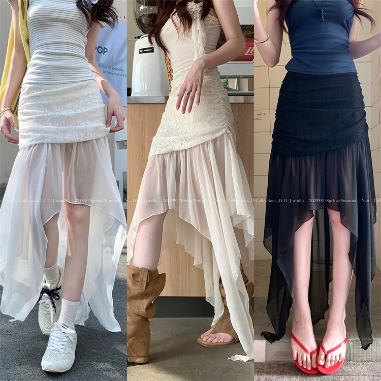 실제 샷과 실제 가격 ~ 레이스 스 플라이 싱 메쉬 불규칙적 인 스커트 허리 디자인 A- 라인 틈새 요정 긴 스커트