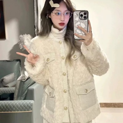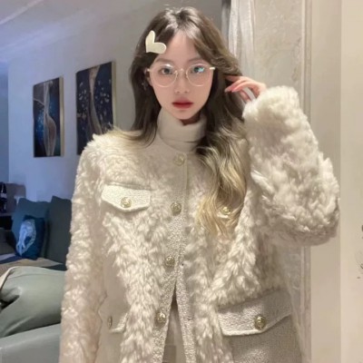 모피 작은 샤넬 스타일 여성 코트 겨울 새로운 고급 센스 코코아 모방 토끼털 코트 두꺼운 라운드 넥 인터넷 유명인 면 의류