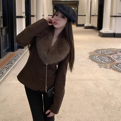 중년 vintage 레트로 커피 색상 여우 머리 모피 칼라 허리 털이 많은 코튼 자켓