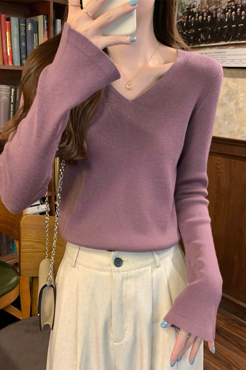 가을 겨울 V- 넥 슬림하고 간단한 슬림면 긴팔베이스 티셔츠 여성을위한
