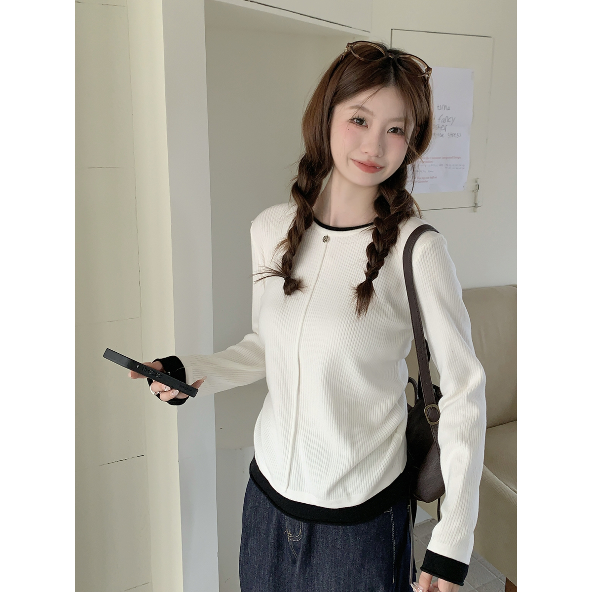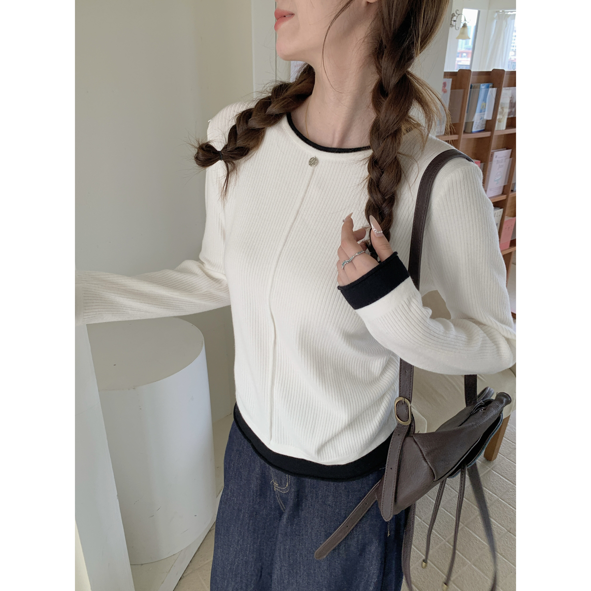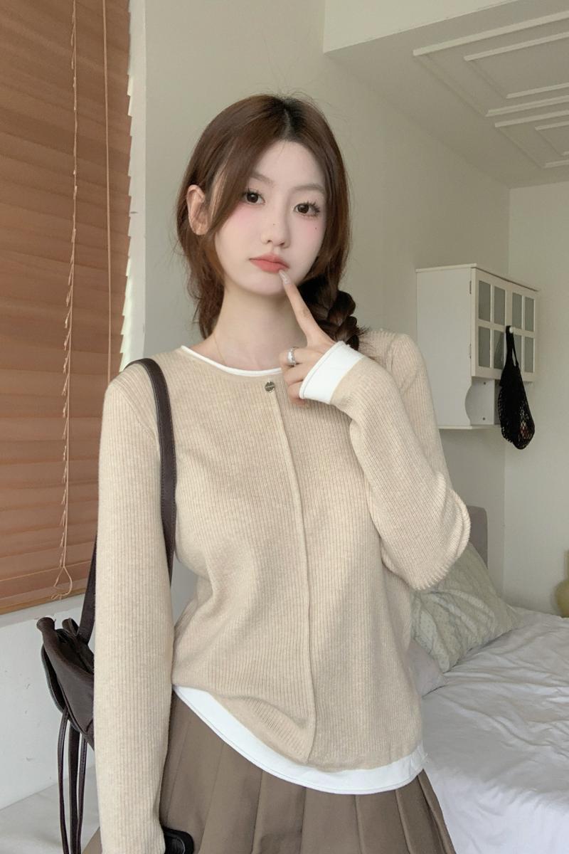 가을 겨울 대조 스트라이프 버튼 여성을위한 슬림면 긴팔 탑