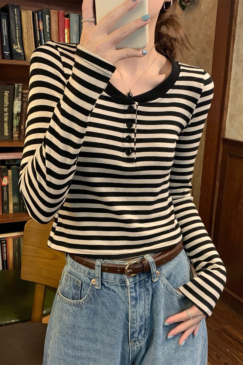 한국 스타일 슬림 걸레 숄더 뼈 뼈 편지 패치 디자인 순수한 면화 긴 소매 안쪽 티셔츠 탑