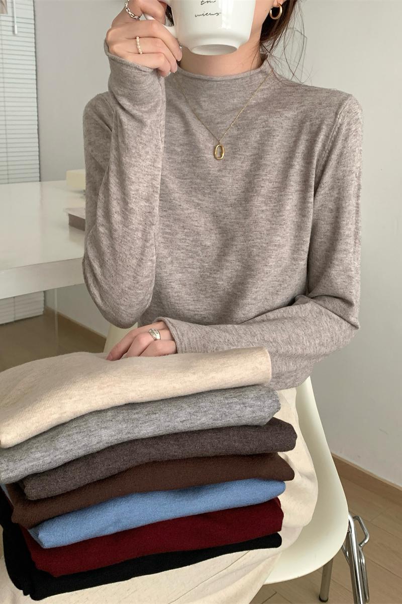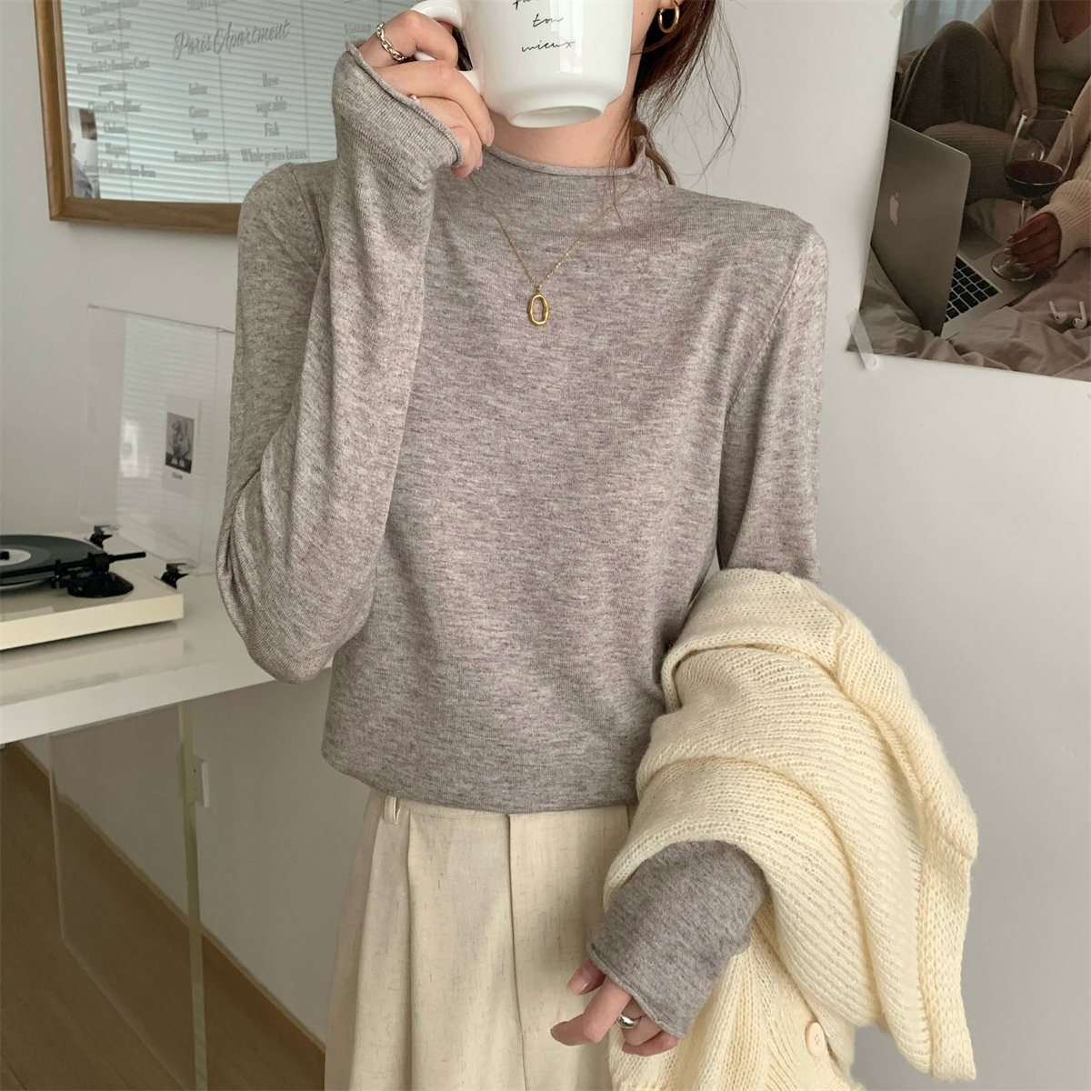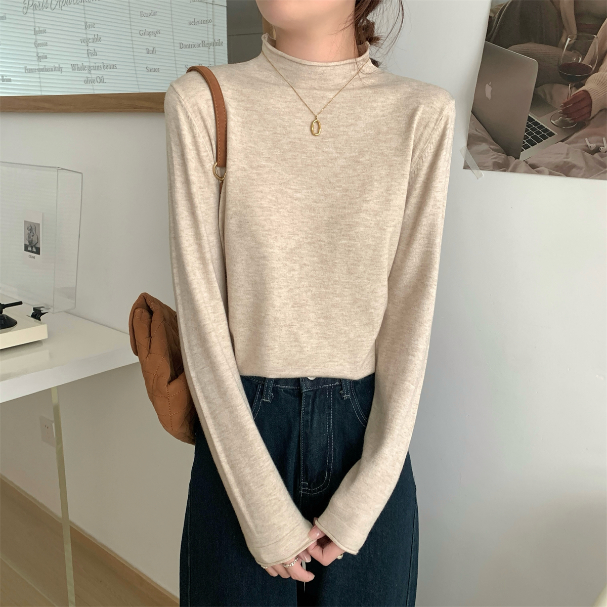 가을 겨울 한국 스타일 대조 색상 반쯤 열리는 칼라 간단하고 다재다능한 긴 소매 티셔츠 여성
