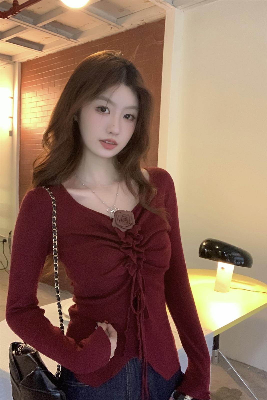 한국 스타일 스퀘어 칼라 버튼 기질 주름 슬리밍 6 양모 스웨터베이스 탑