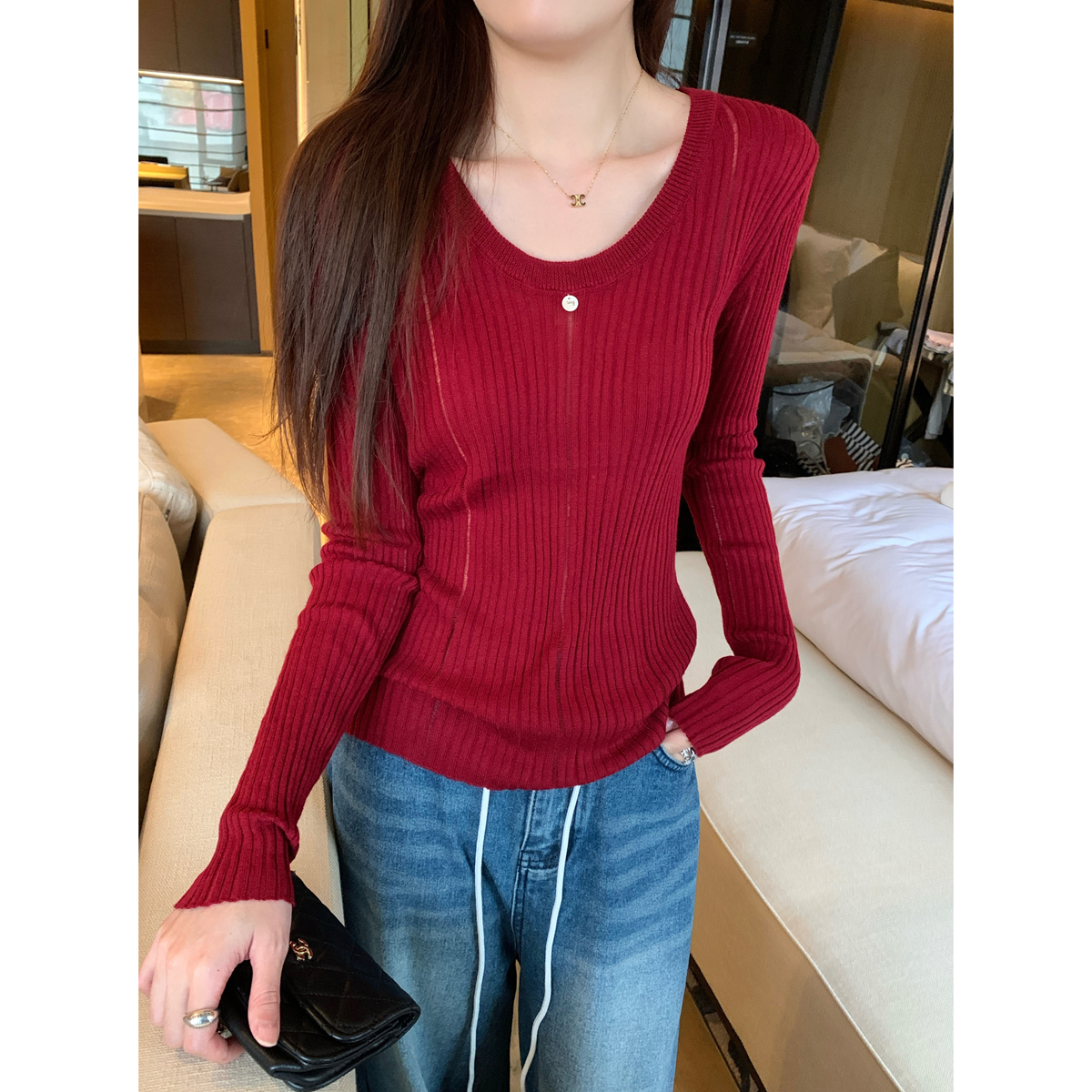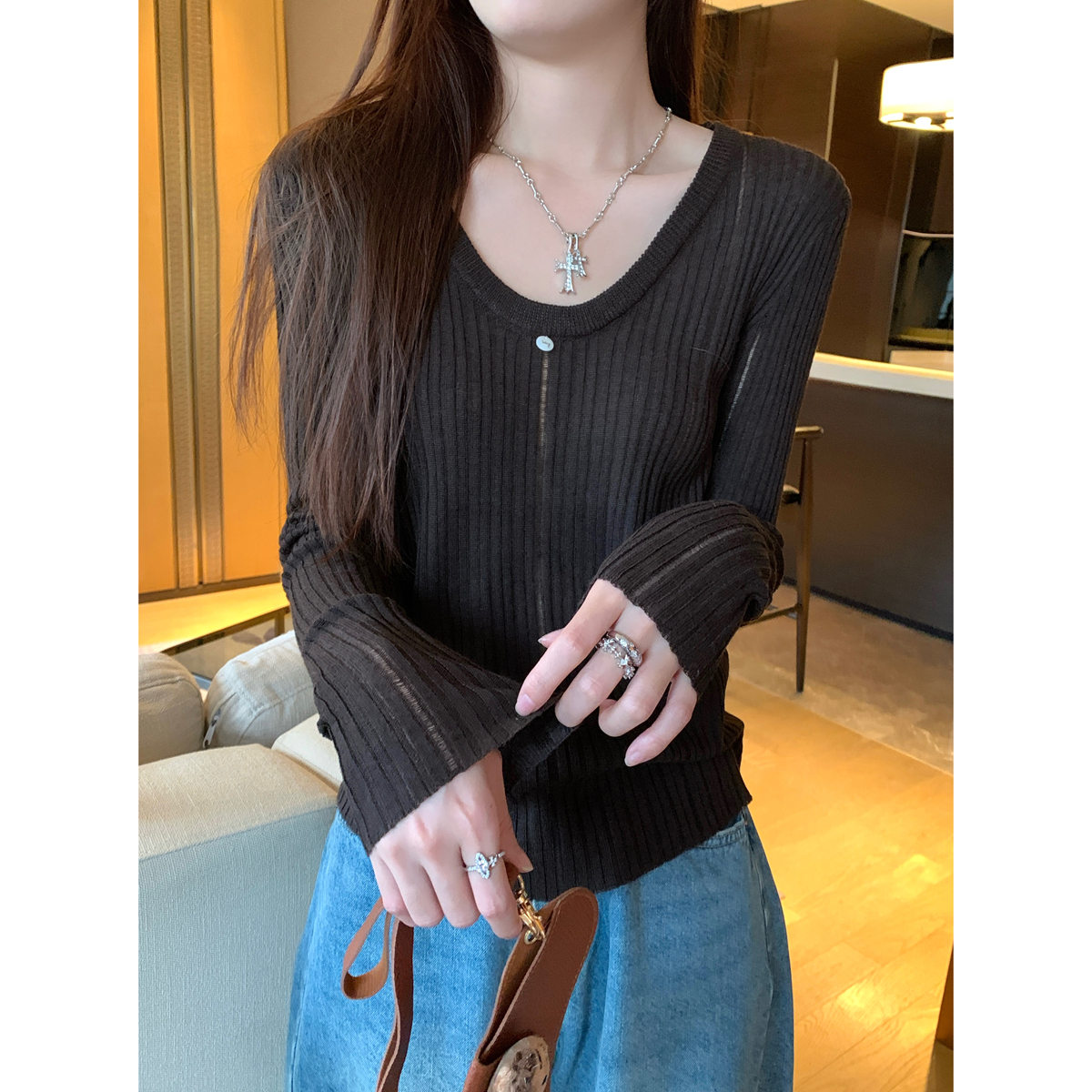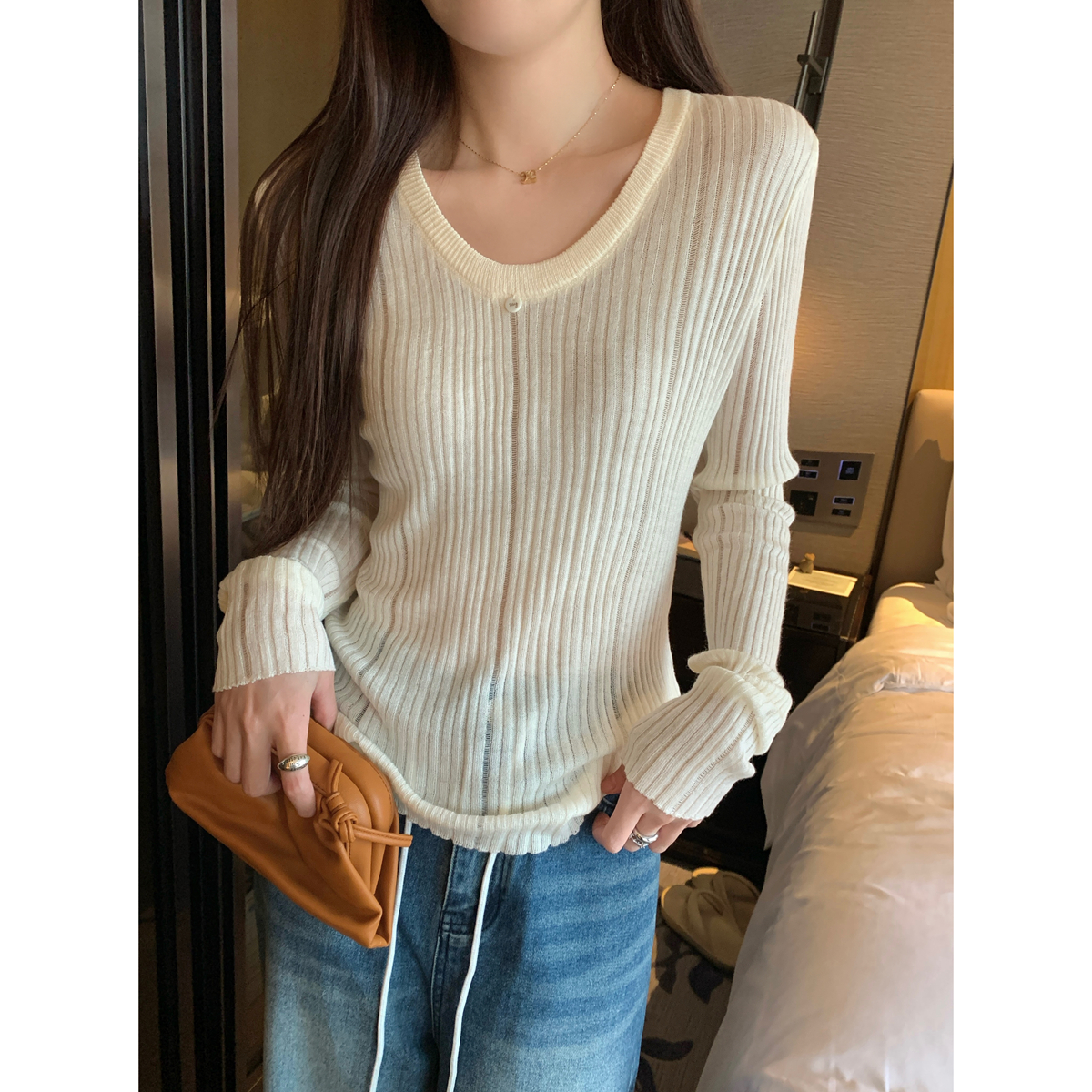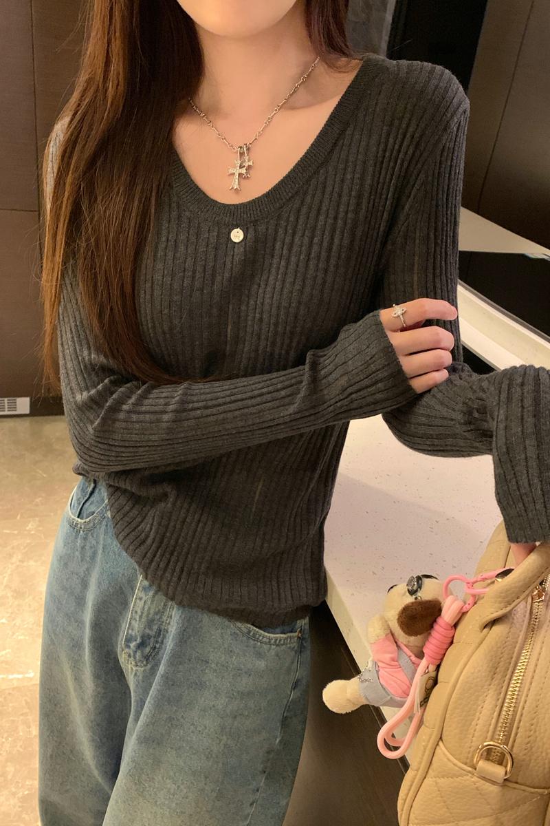 가을 겨울 한국 스타일 슬림 색상 대비 버튼 디자인 2 피스 긴 소매 티셔츠베이스 탑