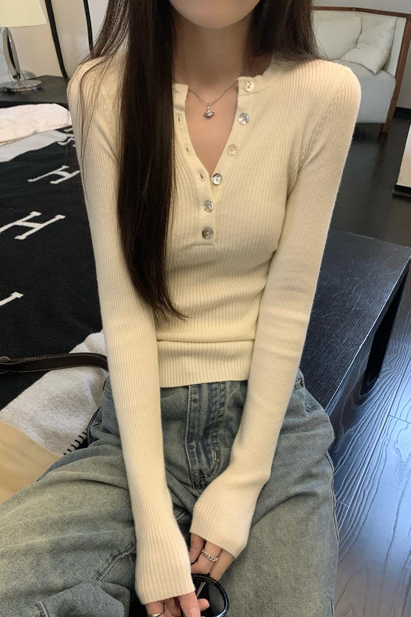 가을 겨울 한국 스타일 V- 넥 스스크 버튼 게으른 6 양모 니트 스웨터베이스 셔츠 여성