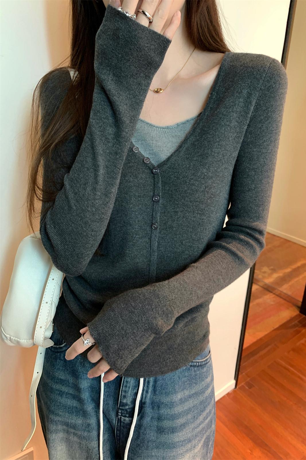 가을 겨울 V- 넥 버튼 대비 색상 2 피스 6 니트 스웨터 긴 말초베이스 탑