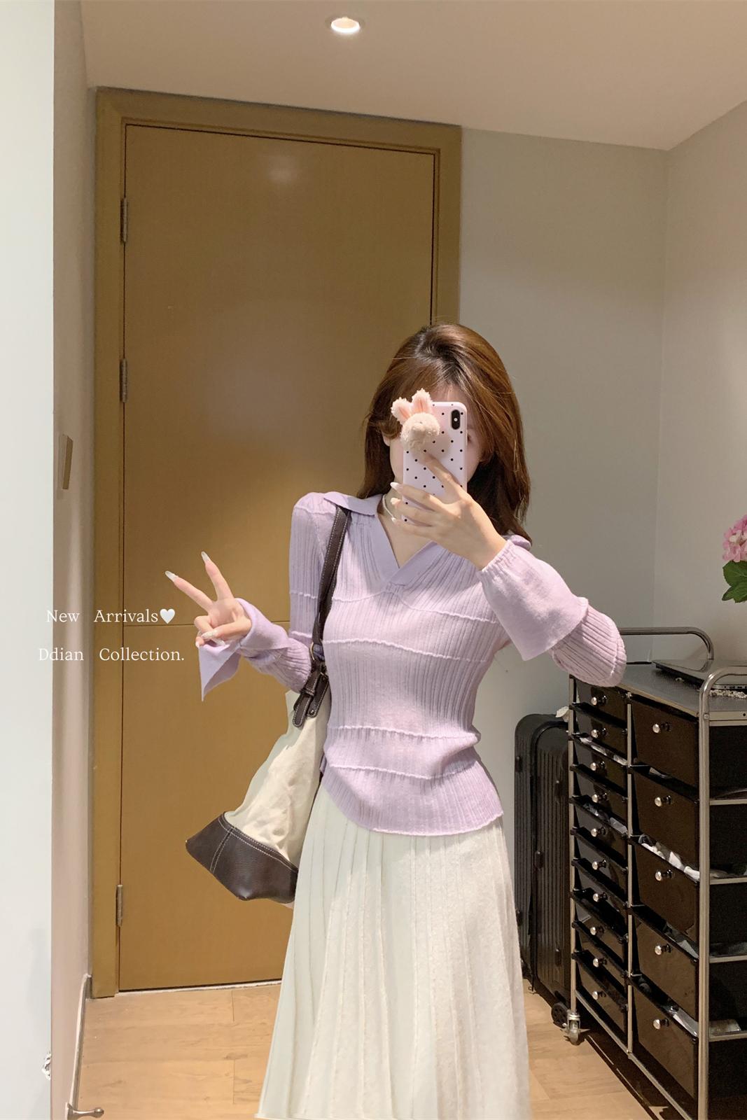 가을 겨울 폴로 칼라 슬릿 플레어 슬리브 6 양모 니트 긴팔 스웨터베이스 탑