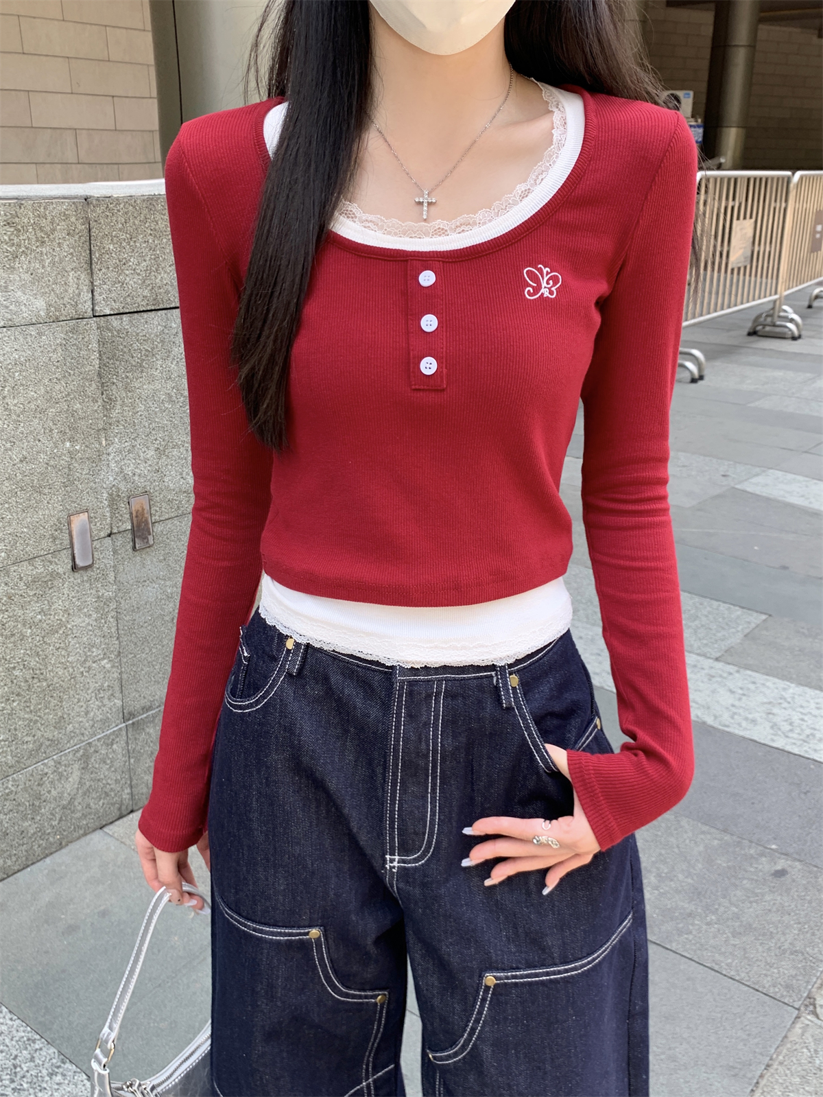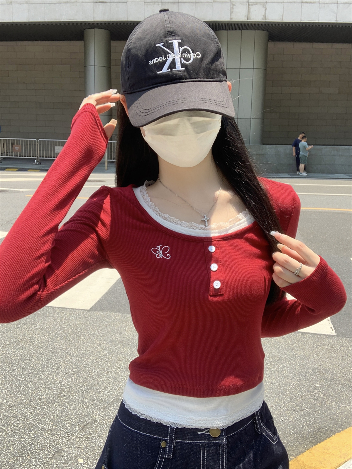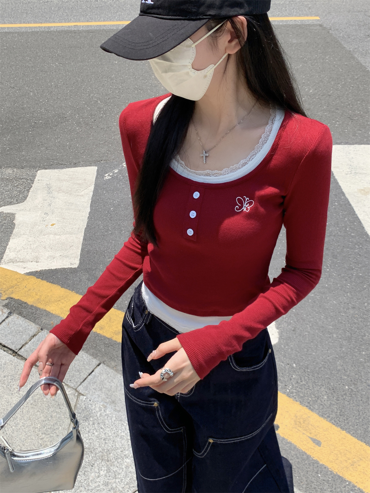 가을 가을 슬림 u-neck 대비 컬러 2 피스 중간 길이 슬림 안쪽 슬림 티셔츠 탑