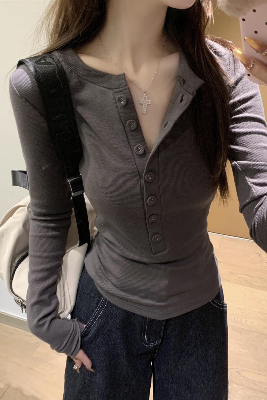 가을 가을 대조 색상 라운드 목 버튼 2 피스 슬림 한 순수 면적 긴 소매 티셔츠 여성.