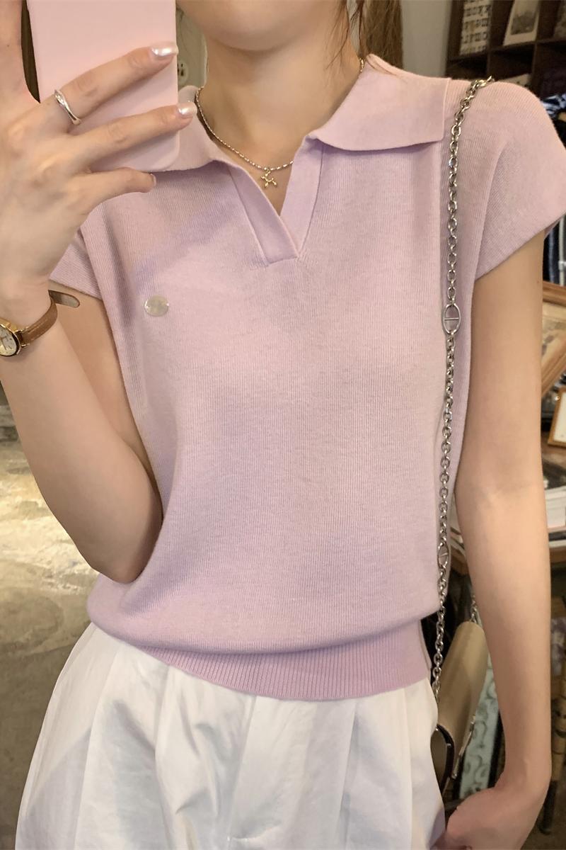 여름 한국 스타일 V- 넥 드로우 스트링 디자인 대나무 조인트 얇은 니트 짧은 소매 탑