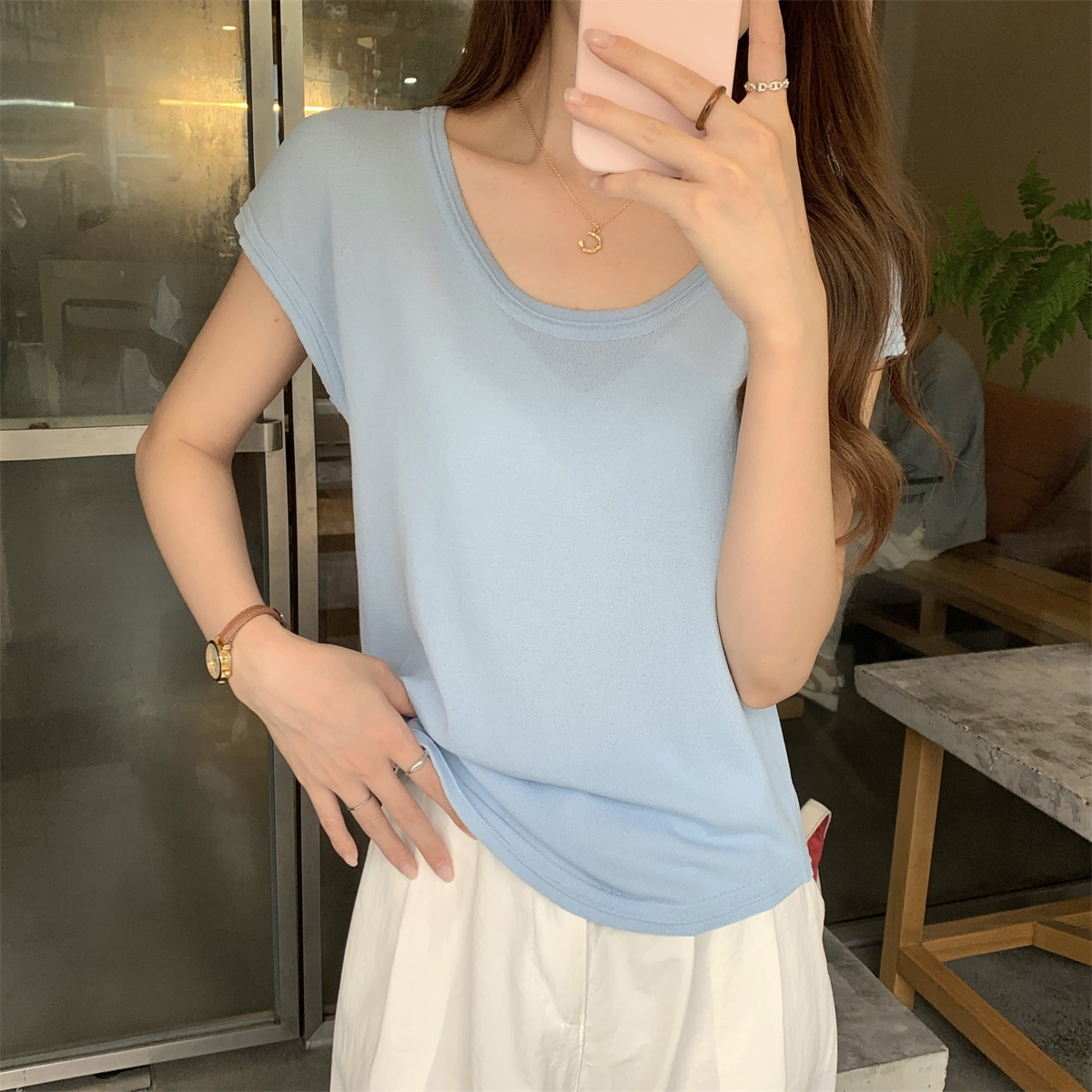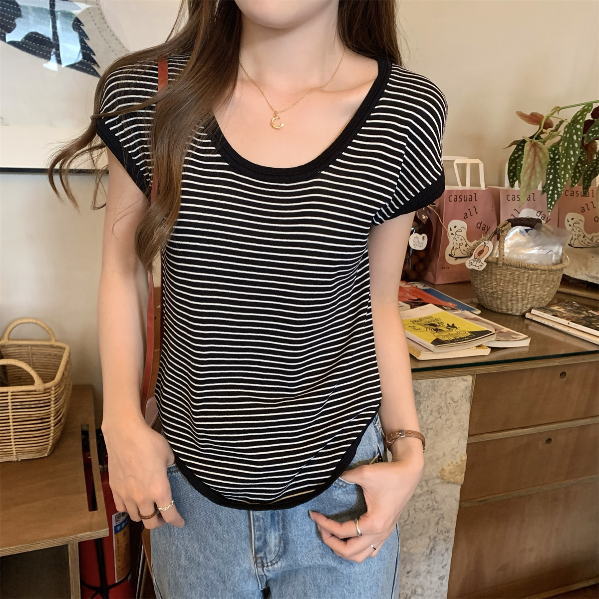 여름 한국 스타일 슬림 나비 인쇄 디자인 니트 스웨터 짧은 슬리브 탑