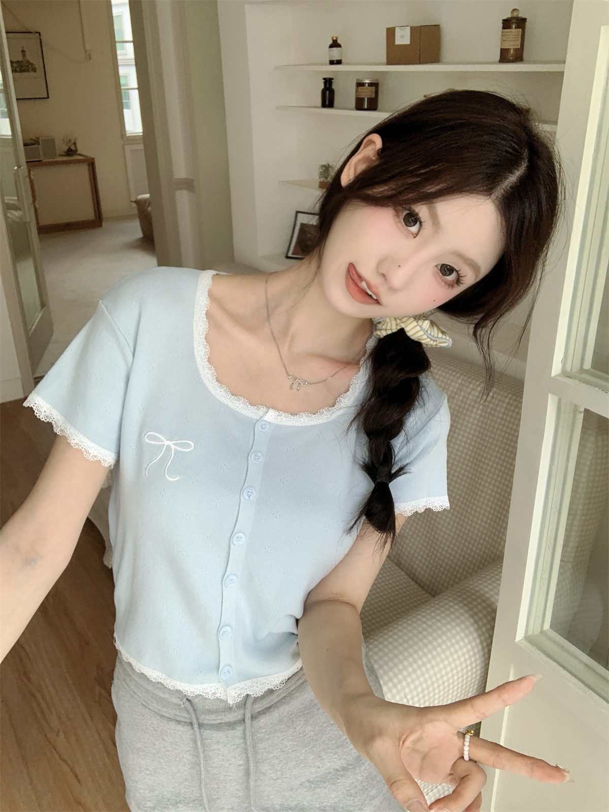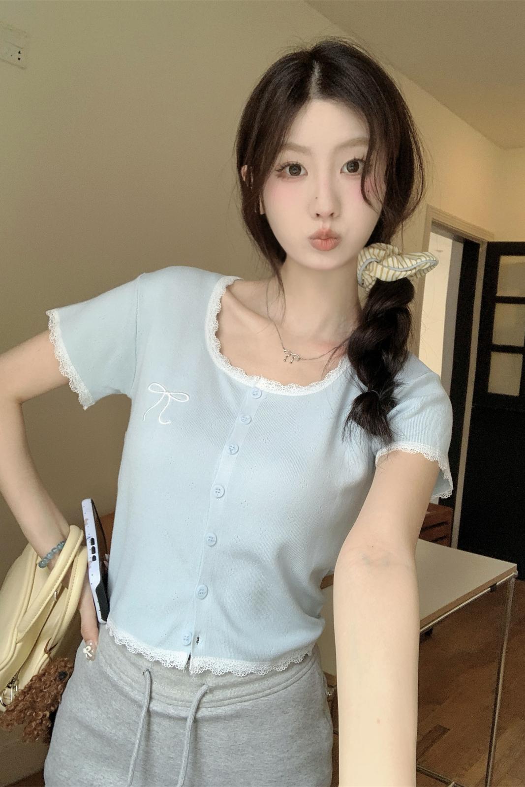 여름 슬림 기질 U-Neck 간단한 단색 얇은 6 개 양모 스웨터 단락 상단