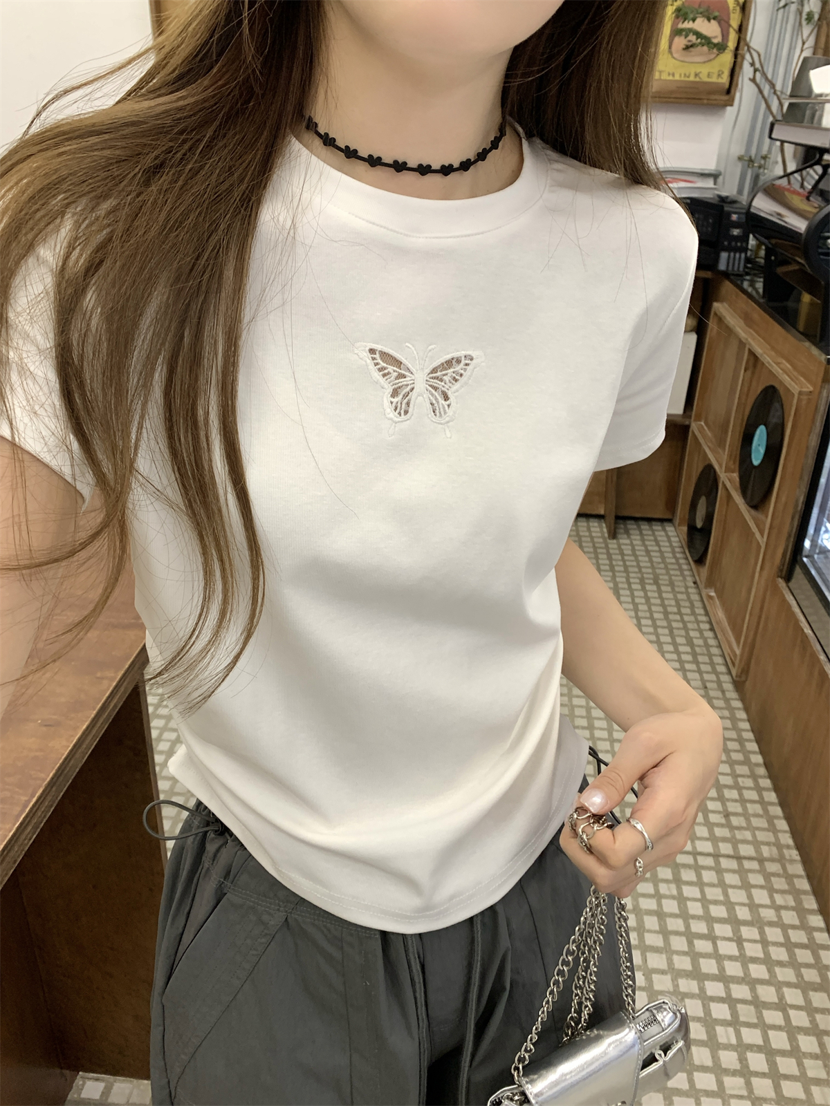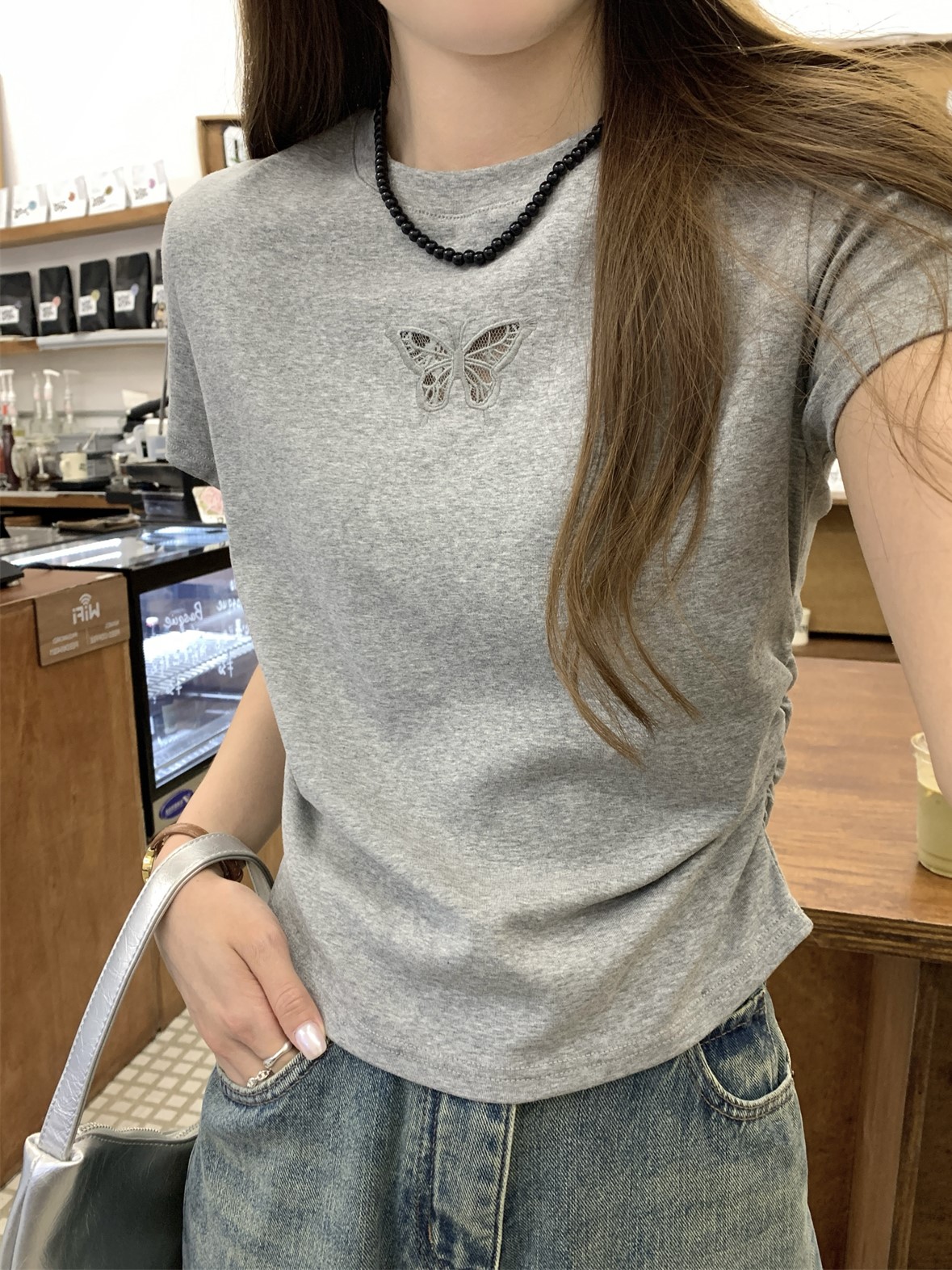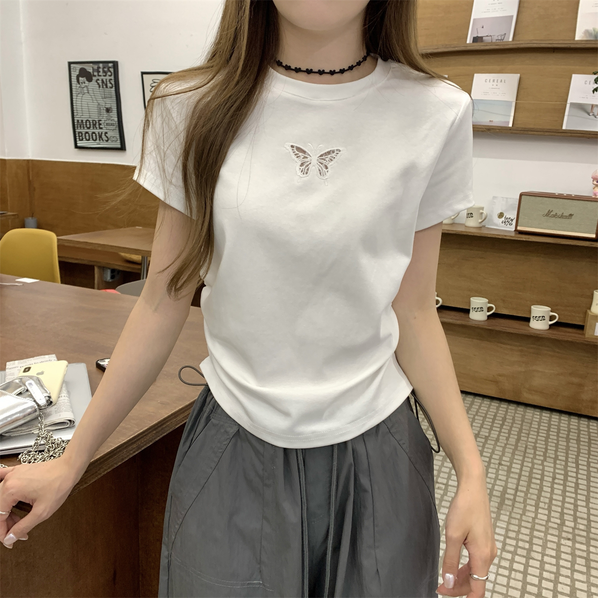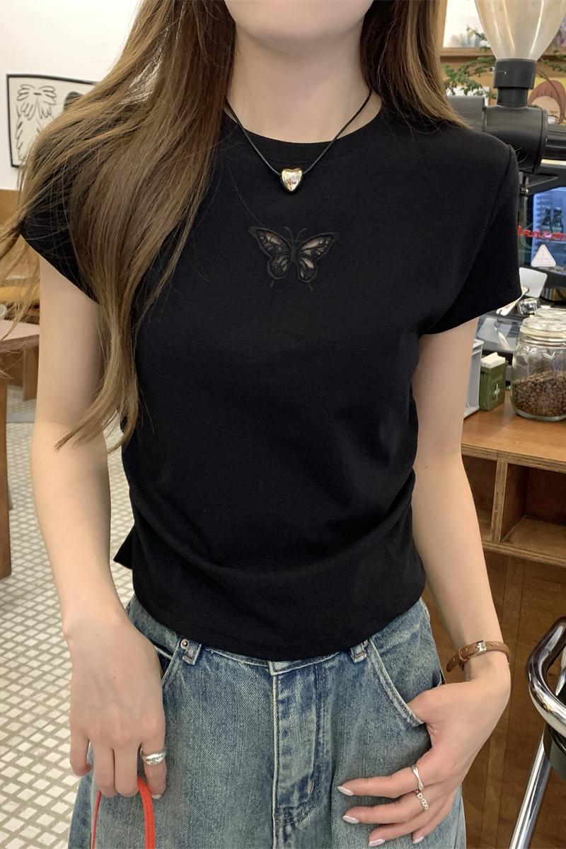 여름 여름 한국어 버전 슬림하고 얇은 6 개 백리스 버튼 디자인 니트 짧은팔 탑