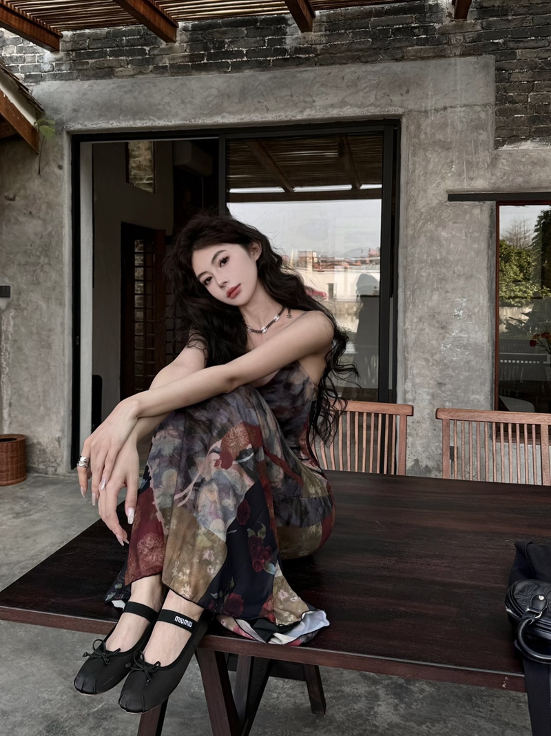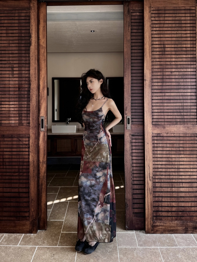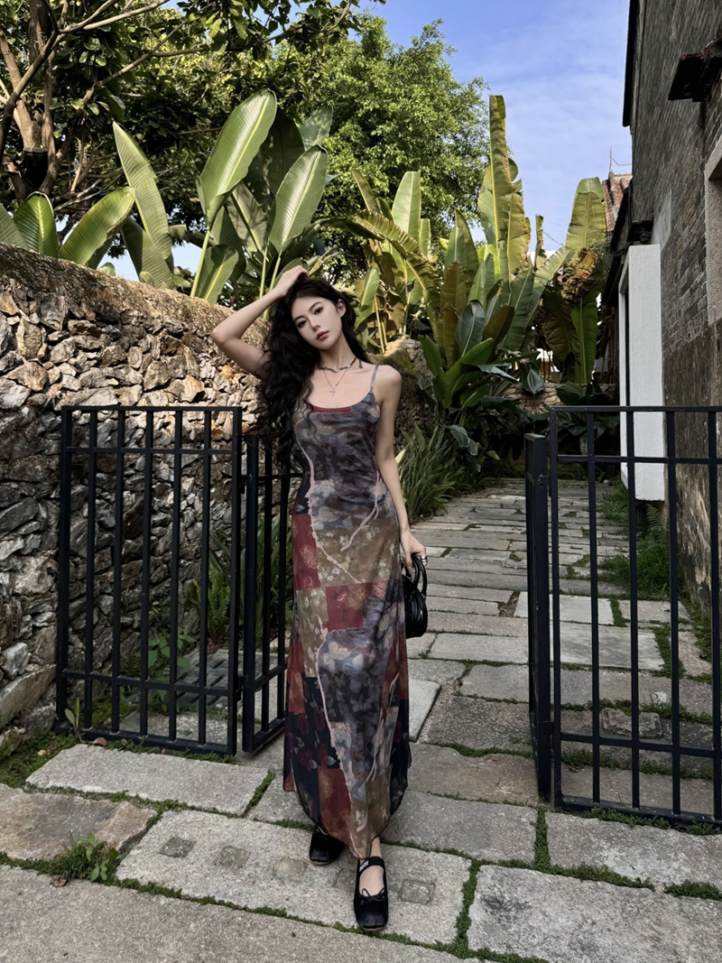 실제 가격 화염과 금 레트로 플로럴 허리 길이 드레스 여성 슬림 스 플라이 싱 서스펜더 긴 스커트의 실제 사진