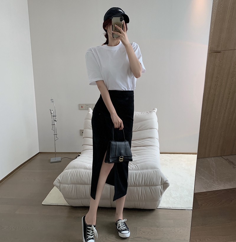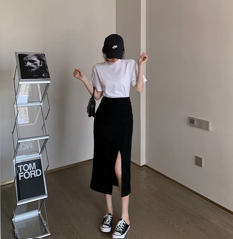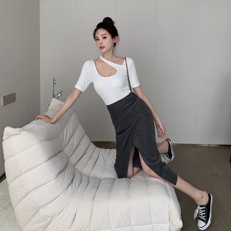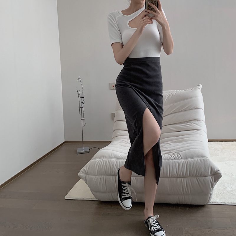 실제 홍콩 스타일의 회색 측면 슬릿 하이 허리 처벌 슬림 엉덩이 A- 라인 스커트