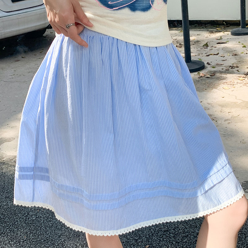 실제 가격의 실제 촬영 샷 여성을위한 실제 가격 블루 스트라이프 레이스 레이스 스커트 2025 뉴 여름 하이 허리 슬림 한 A- 라인 짧은 치마